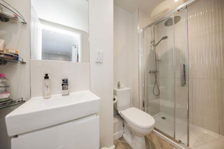 EN-SUITE: Wide walk in shower with rain head and hand held attachment, WC, wash basin, tall chrome heated towel rail, extractor.
