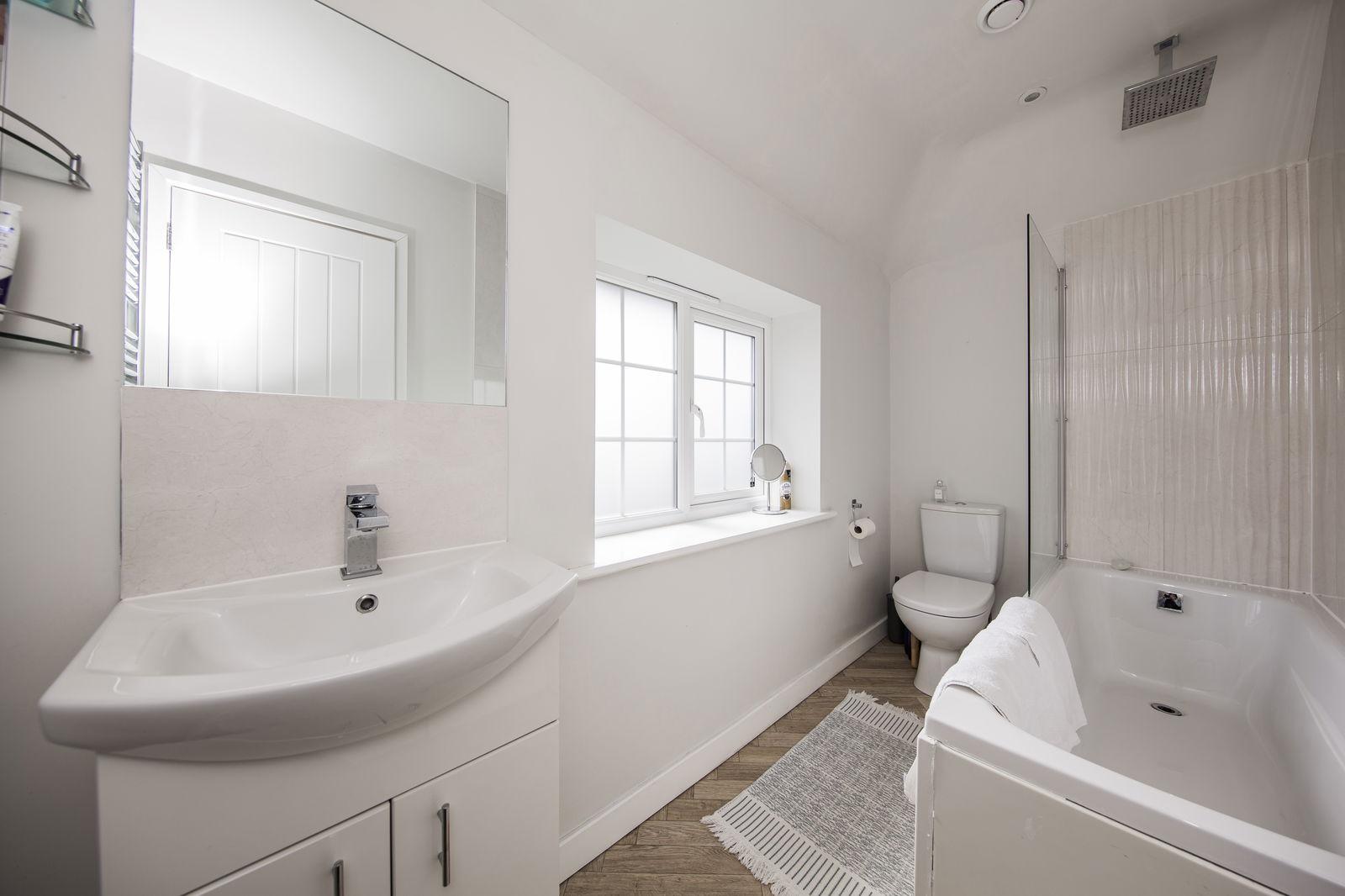 BATHROOM: Frosted window, bath with rain head shower over and separate hand held attachment, extractor fan, WC, wash basin, tall chrome heated towel rail.