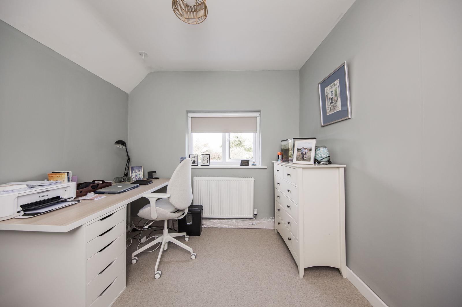 BEDROOM/STUDY: Double, window overlooking garden, carpeted, radiator, space for wardrobes, fitted blind.