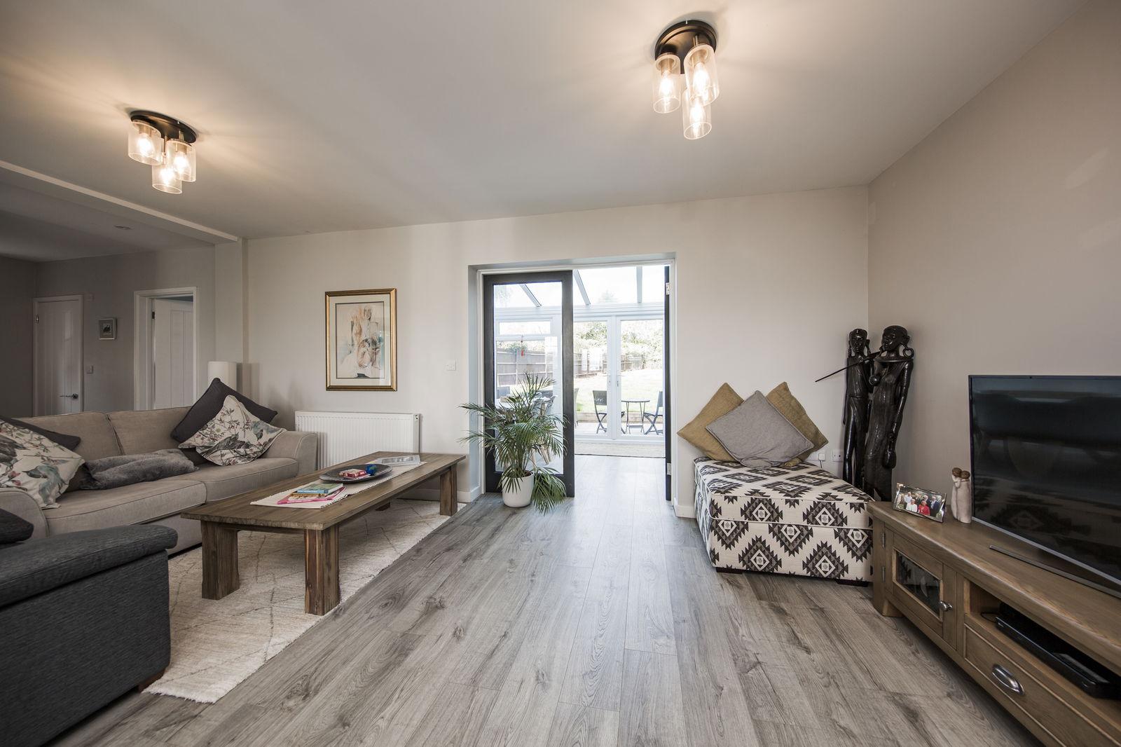 LIVING/KITCHEN/DINING Two windows at front overlooking the fields, one and a half sink, quartz work surfaces, gloss wall and floor cabinets, integrated dishwasher, four ring induction hob, fan oven and grill, fitted fridge/freezer, island with fitted cupboards, space for four stools, space for good size table and chairs, sofas and desk, double doors to conservatory.