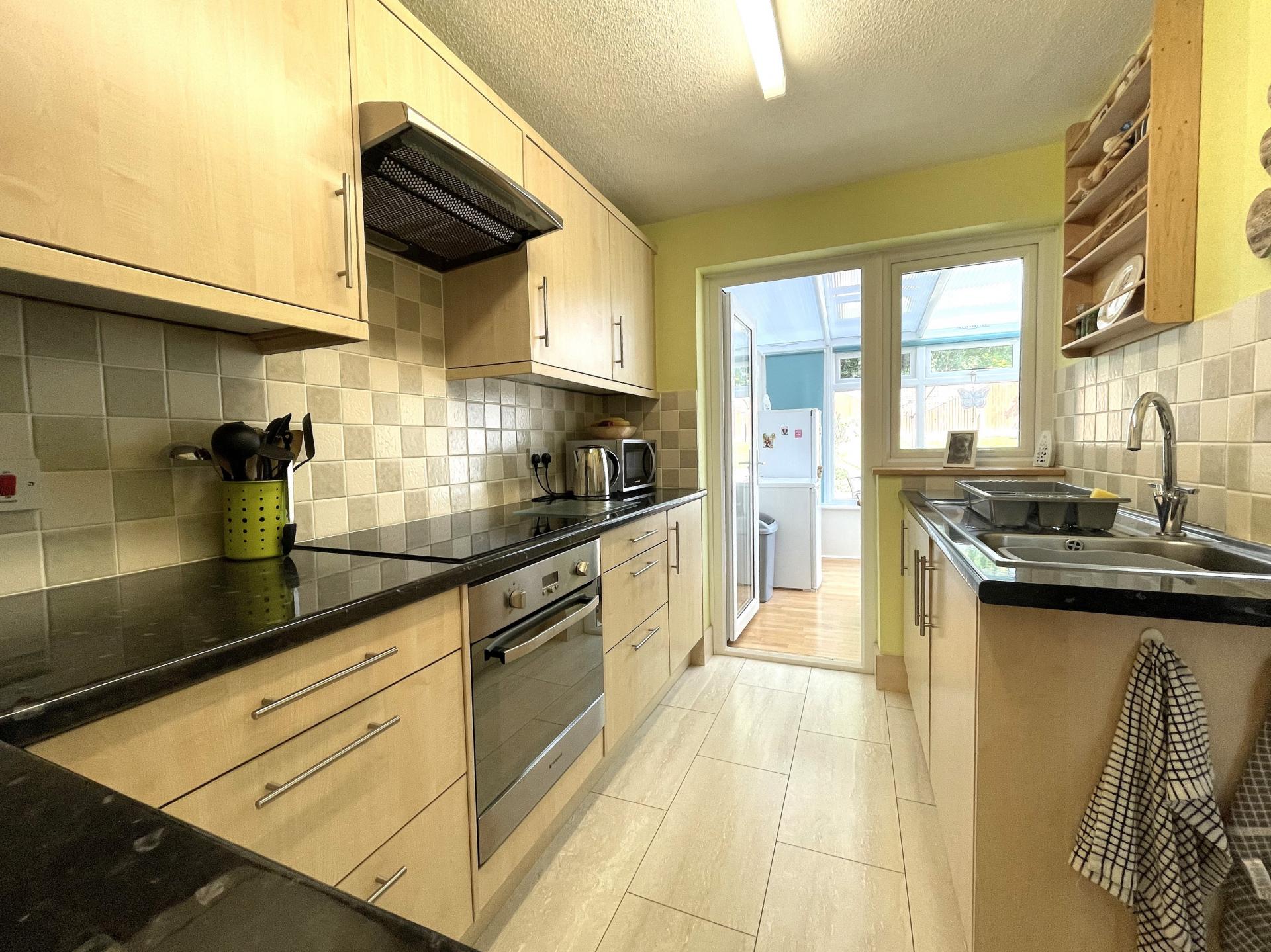 Double glazed window to rear, Double glazed door to conservatory, stainless steel sink and drainer with cupboards under and a further range of matching base and wall units, integrated washing machine, inset induction hob with electric oven under and extractor fan over, ceramic wall tiling and tiled flooring.