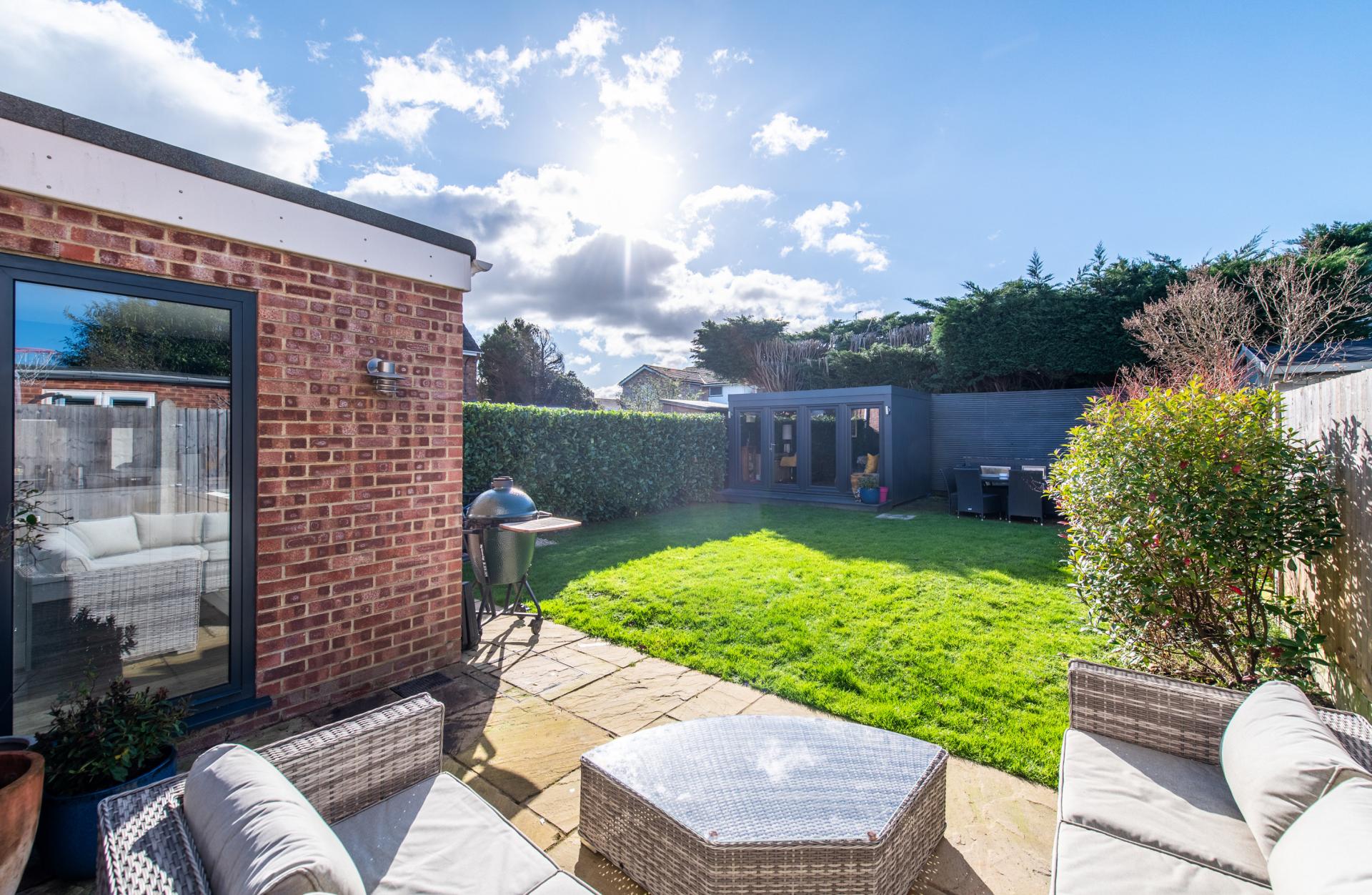 The rear garden features a charming stone patio, perfect for outdoor entertaining, while the remainder is predominantly laid to lawn. Attractive side borders are planted with a variety of shrubs and plants, access to home office/summerhouse.