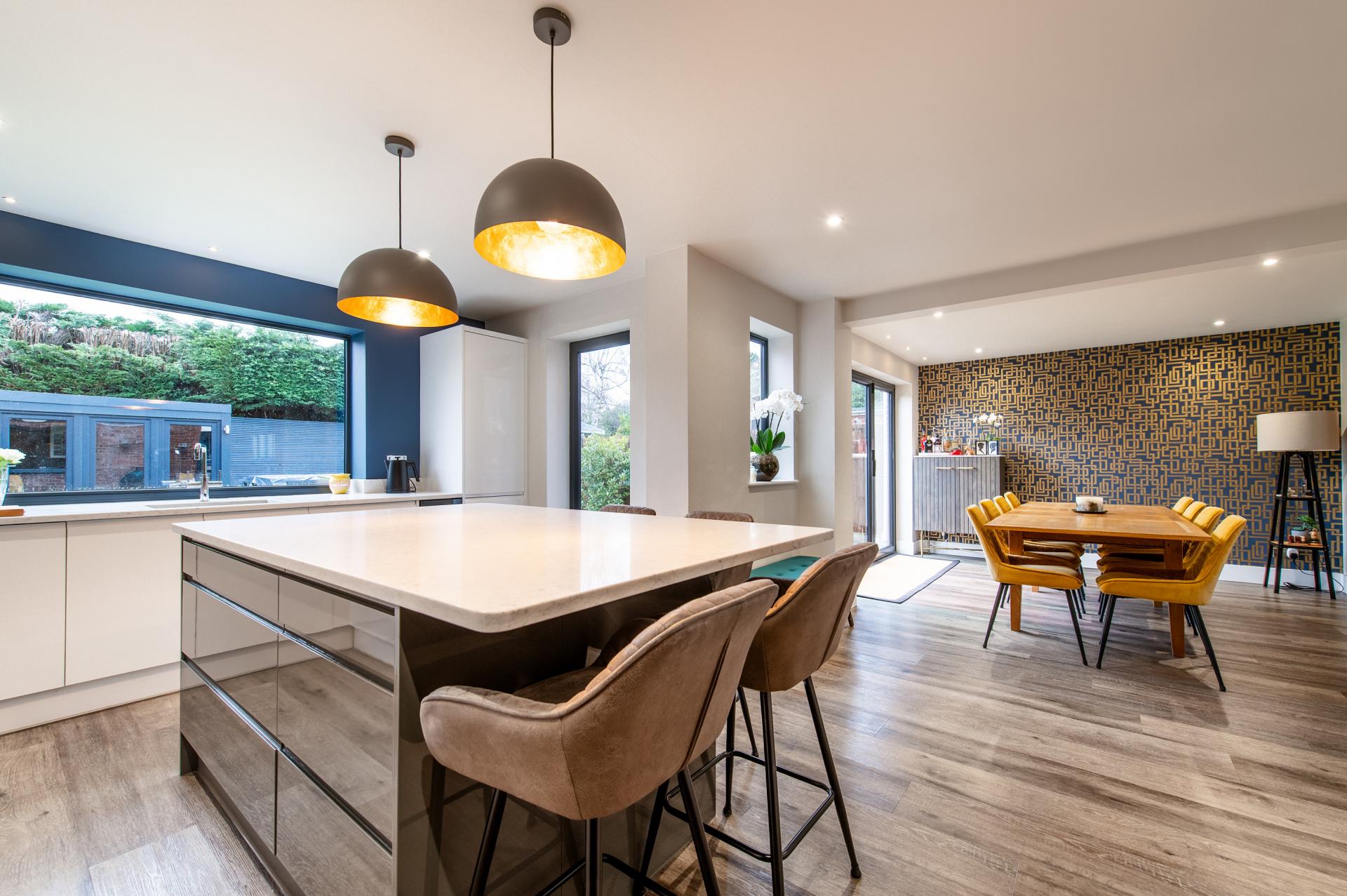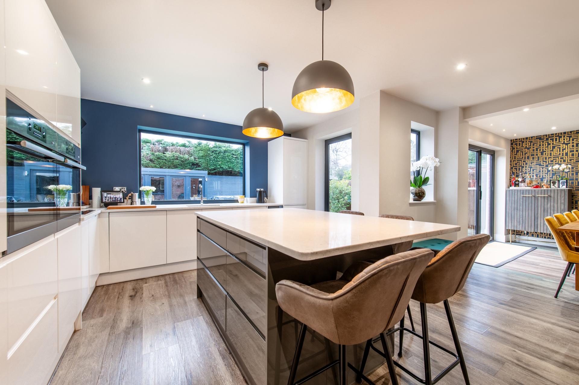 Double glazed window to rear, one and a half bowl sink set within Quartz worktop with cupboards under and further range of matching base a wall units, integrated double electric ovens, electric hob with extractor hood over and glass splashback, integrated wine fridge, integrated dishwasher, integrated bin, wood effect flooring (Karndean). Space for American Style Fridge Freezer, set within housing unit, central island with Quartz worktop over and cupboards under. Wooden door leading to utility area.