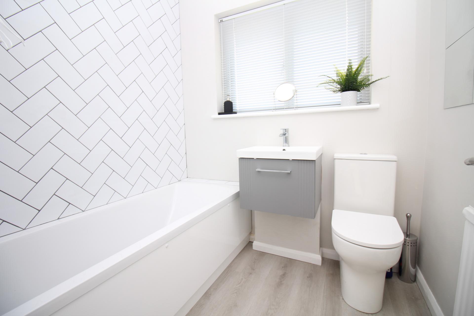 Double glazed to rear, newly fitted suite comprising: low level WC, pedestal was hand basin set within vanity unit, panelled bath with mixer taps and hand held shower attachment and splash back in herringbone pattern in a white metro tile. Radiator.