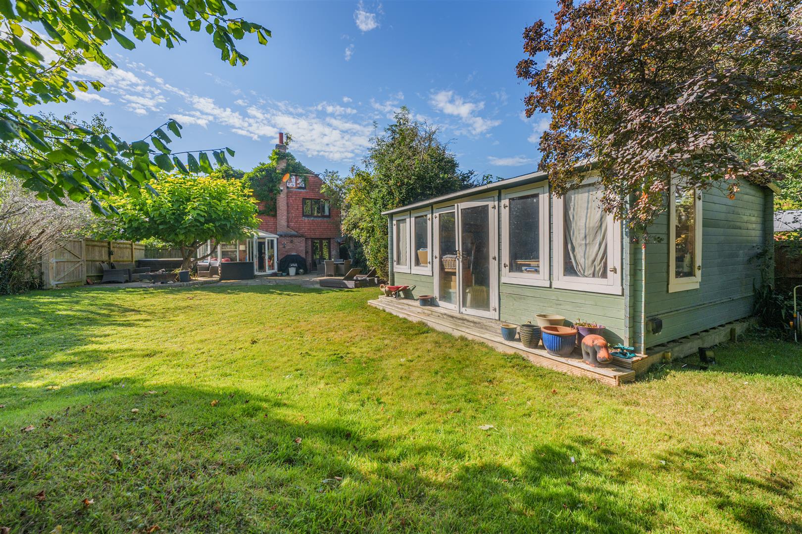 Outside, the property offers ample parking with a driveway extending to the side and a detached garage with a pitched, peg-tiled roof. The beautifully landscaped garden features a variety of fruit trees, shrubs, and borders, all backing onto working orchards that provide stunning views. A well-appointed summer house with power and water currently serves as a studio, offering flexible use as a home office, salon, or children's play area.