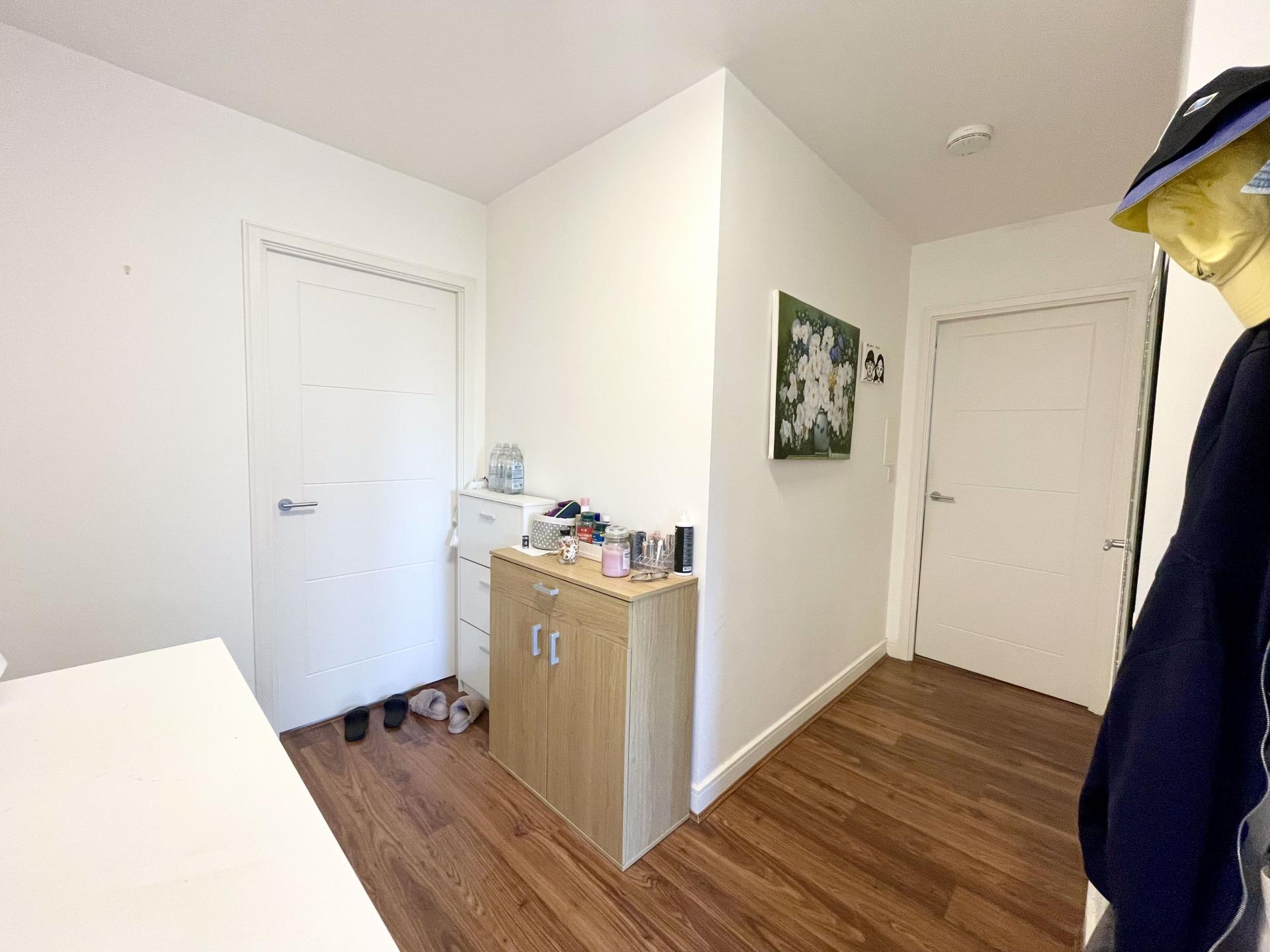 Doors to bedrooms, bathroom and open plan living space, storage cupboard housing boiler.