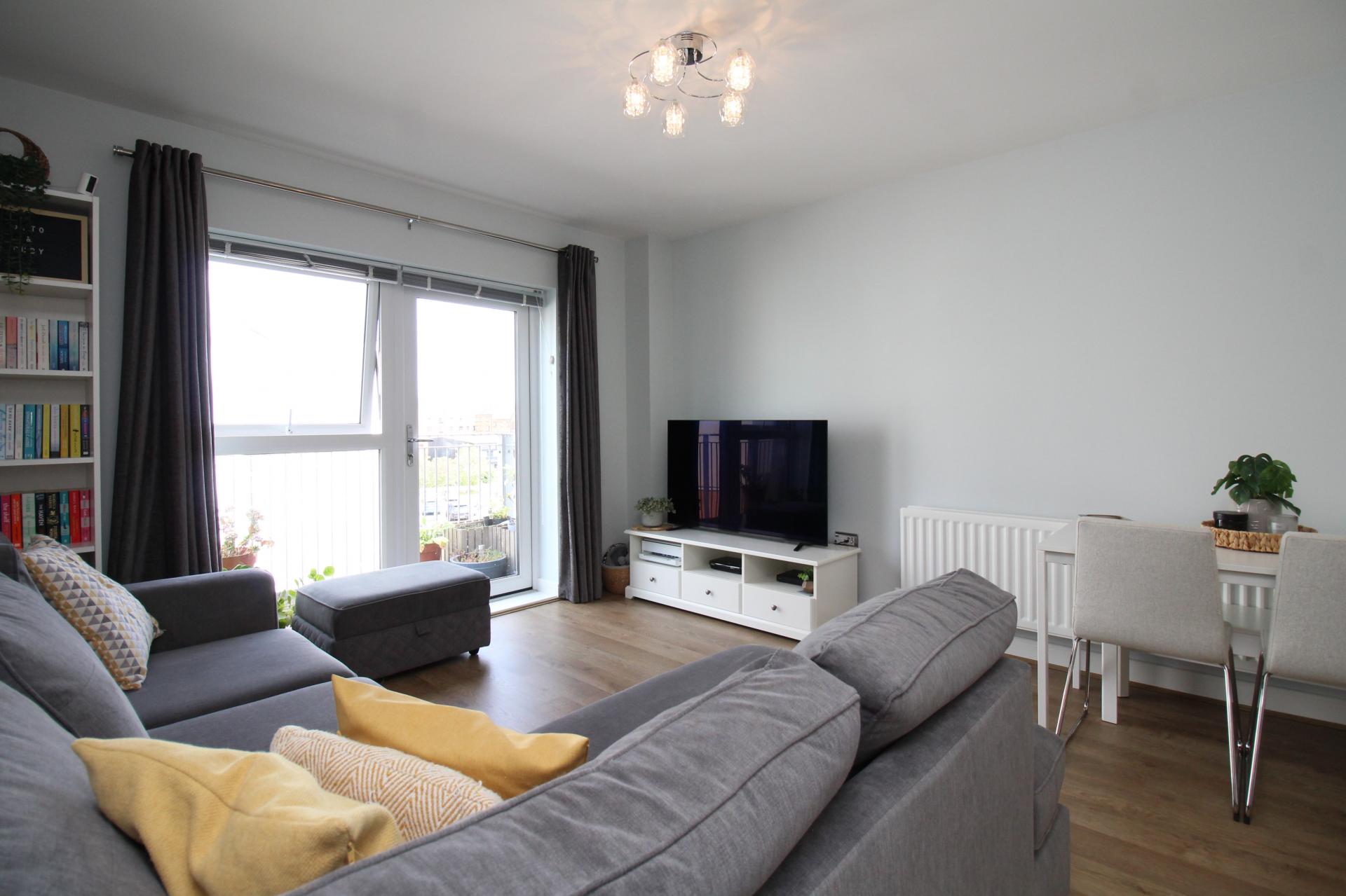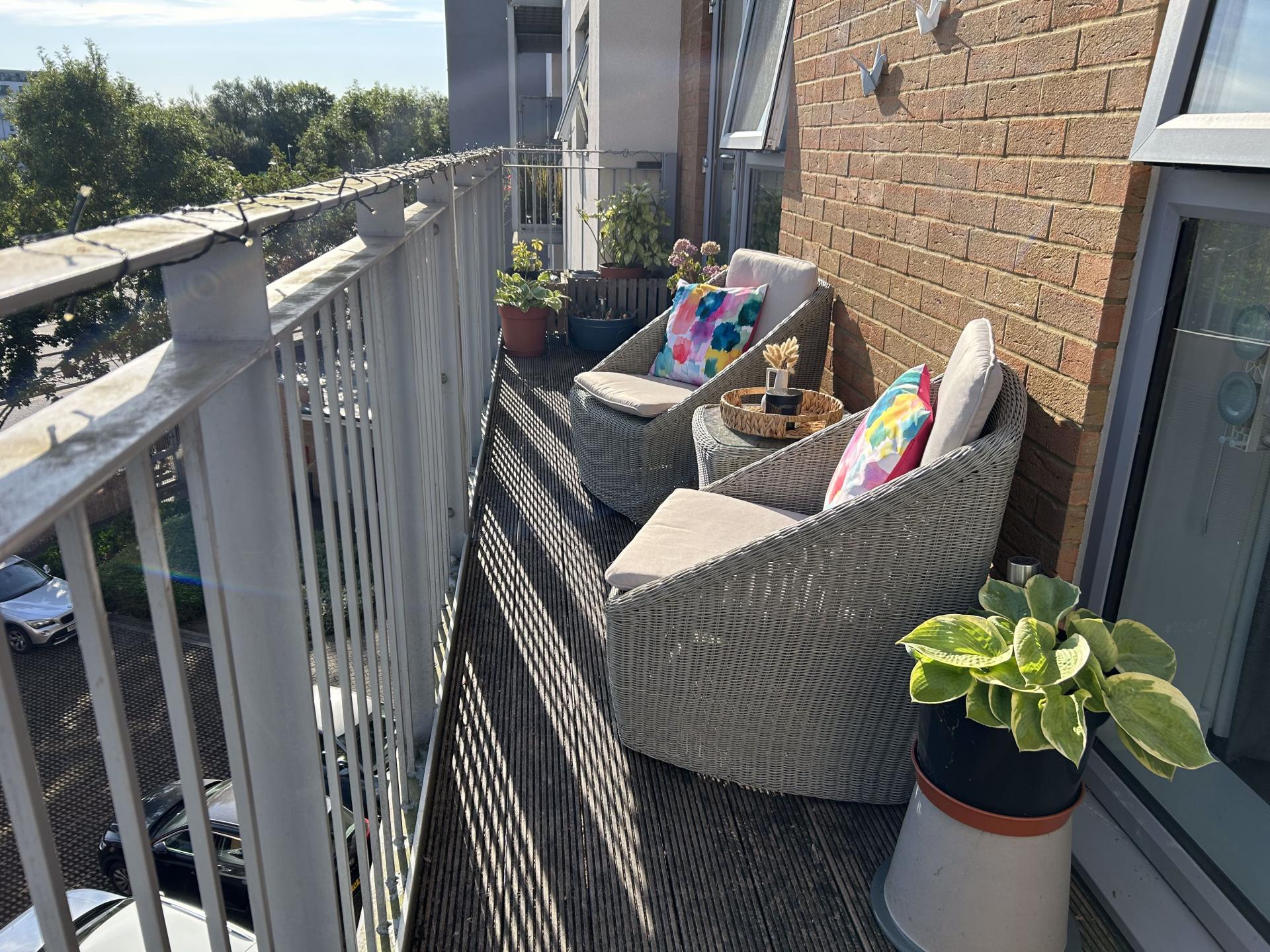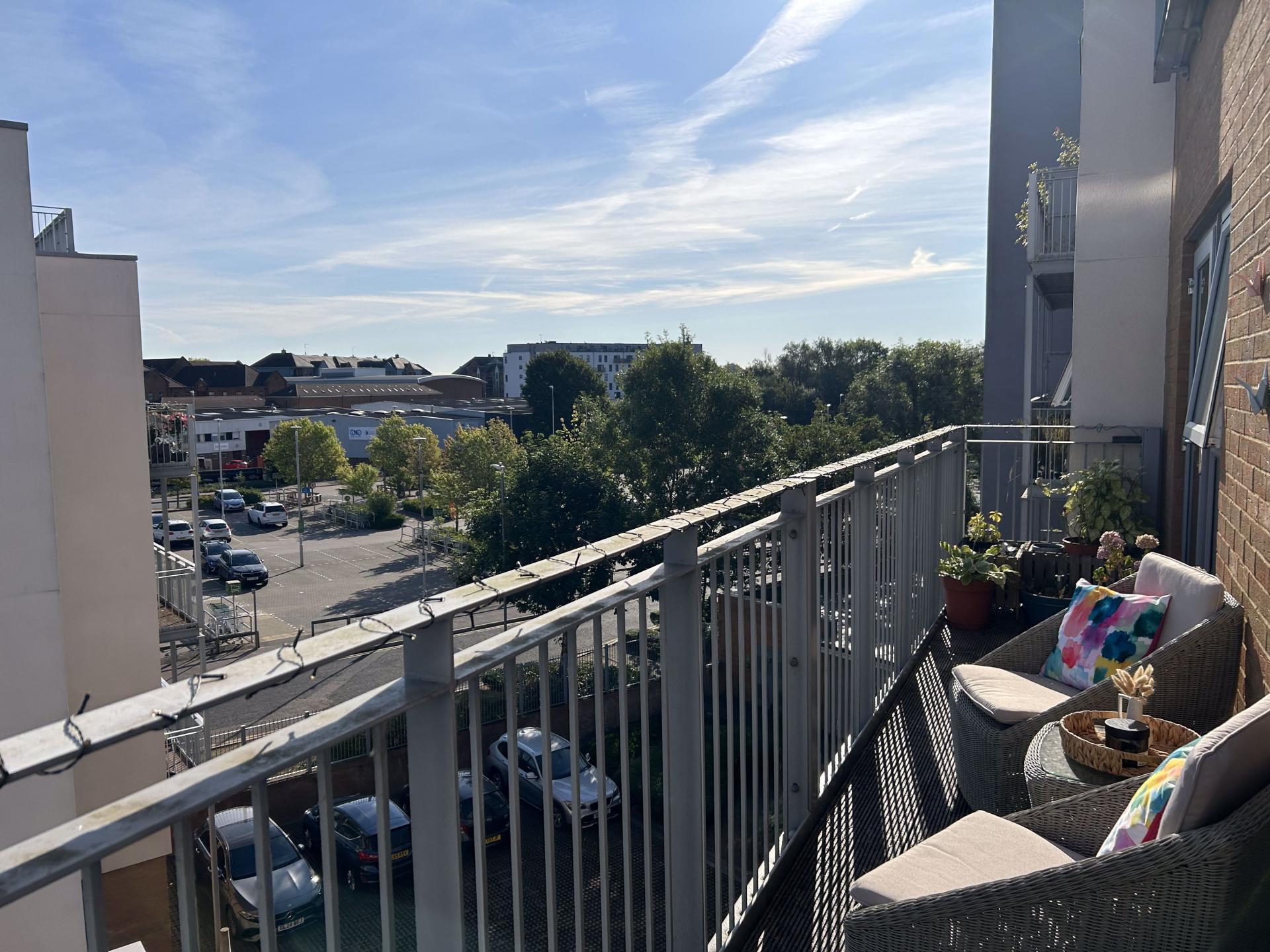 Decked balcony which is the the length of the flat, with access points from both bedroom and living room, over looking Sovereign Way.