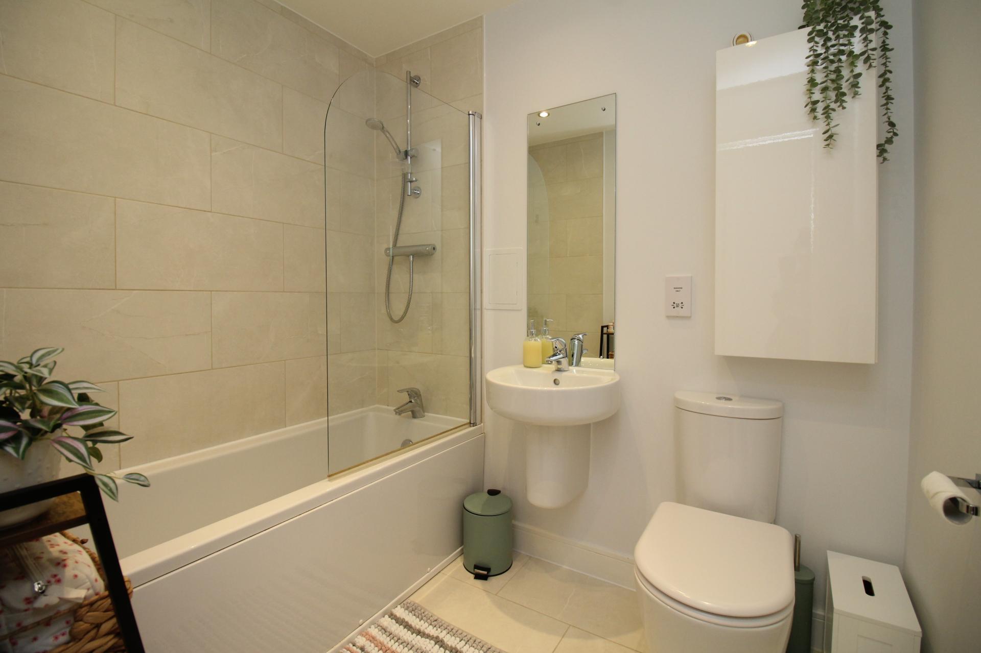 Panelled bath with shower over, low level W/C, floating hand wash basin with wall mounted mirror, wall cabinet, shaver socket, inset spotlights, extractor fan, tiled flooring, ceramic wall tiling and heated chrome towel rail.