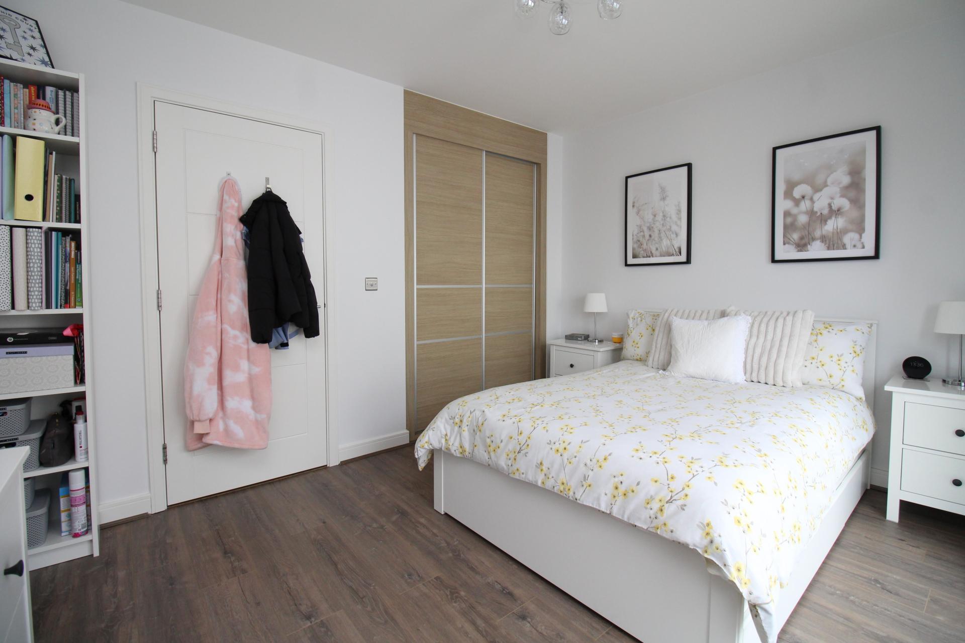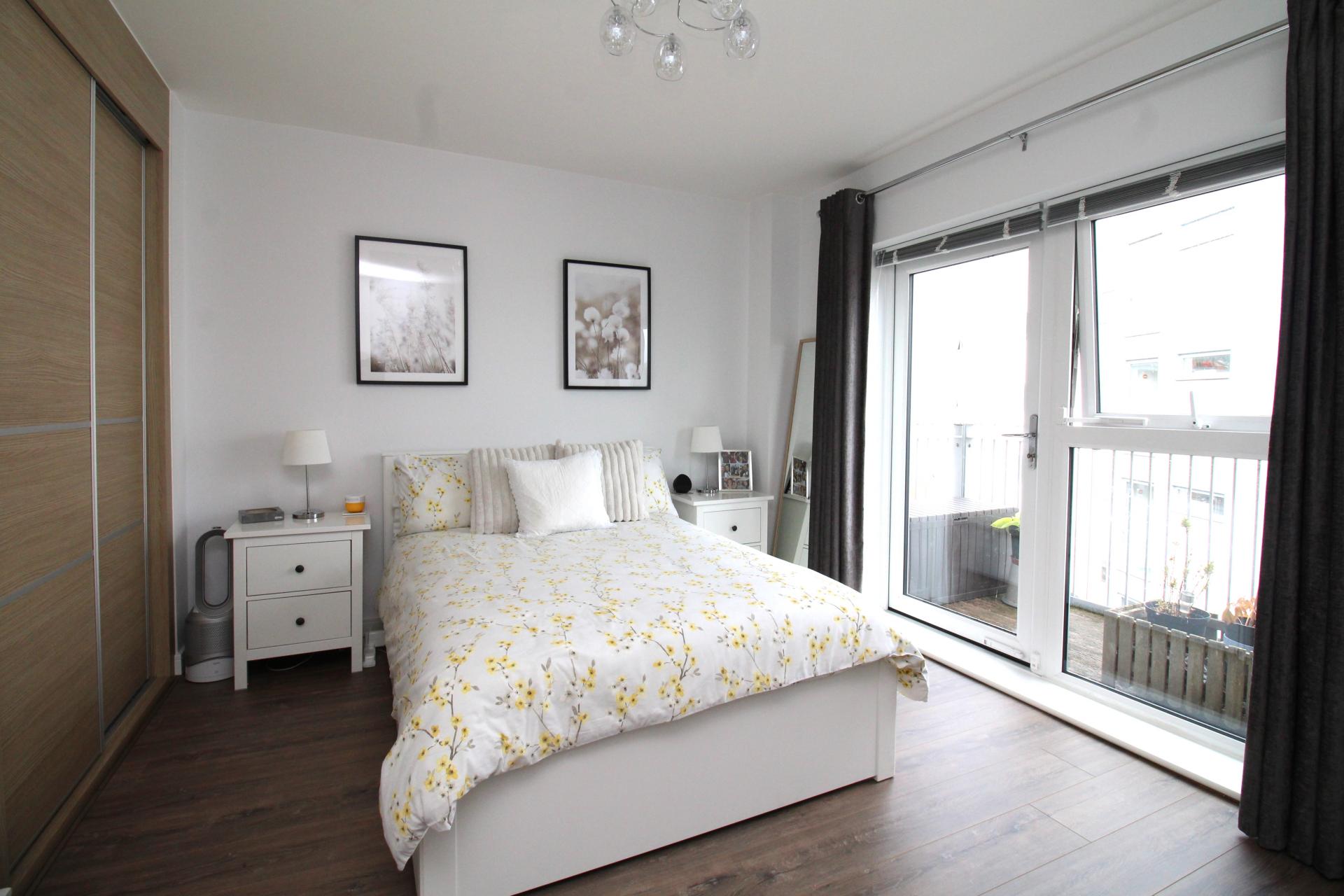 Double bedroom with double glazed door leading to balcony with matching side windows, built in wardrobe with sliding door and radiator.