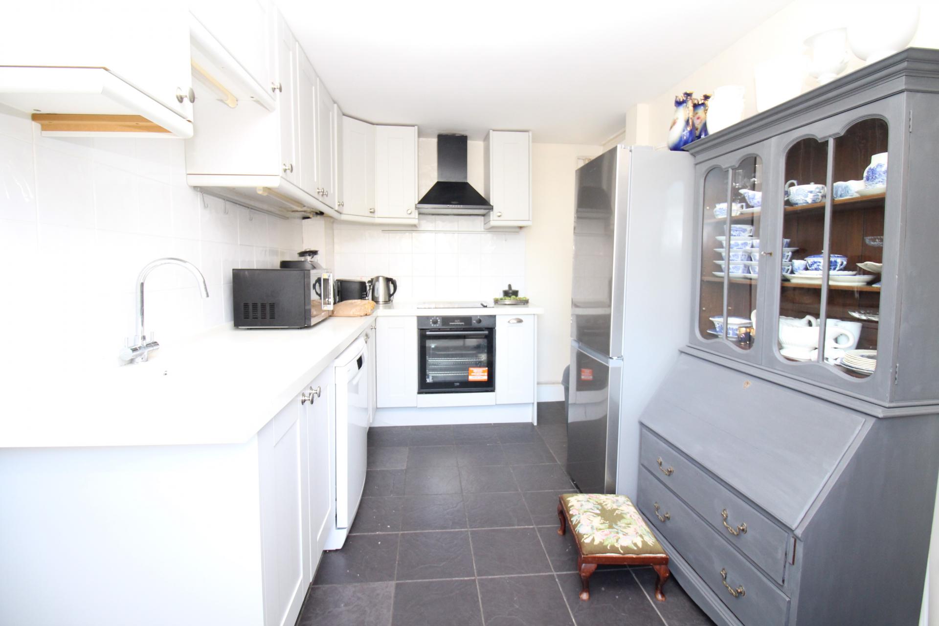Sash window to front, sink set within worktop with cupboards under and a further range of matching base and wall units. Integrated dish washer and space for free standing fridge freezer. Built in electric oven with four ring halogen hob and extractor hood over, door to rear lobby, under stairs storage cupboard with space and plumbing for washing machine, ceramic wall tiling, tiled flooring and radiator.