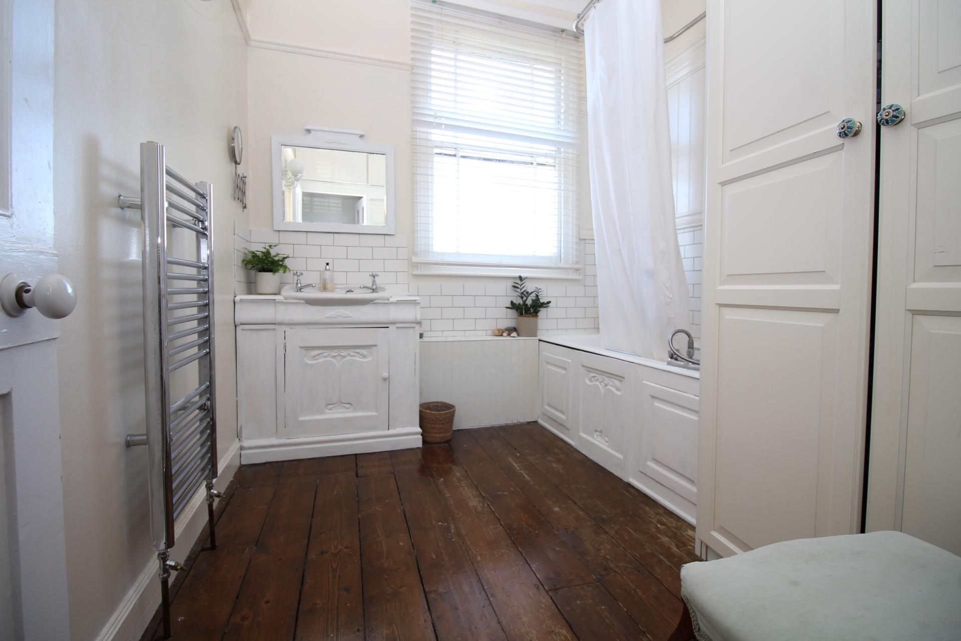 Sash window to front, stripped wood flooring, panelled bath with mixer taps and shower attachment, hand wash basin set within vanity unit, a selection of built in storage cupboards, ceramic wall tiling and chrome heated towel rail.