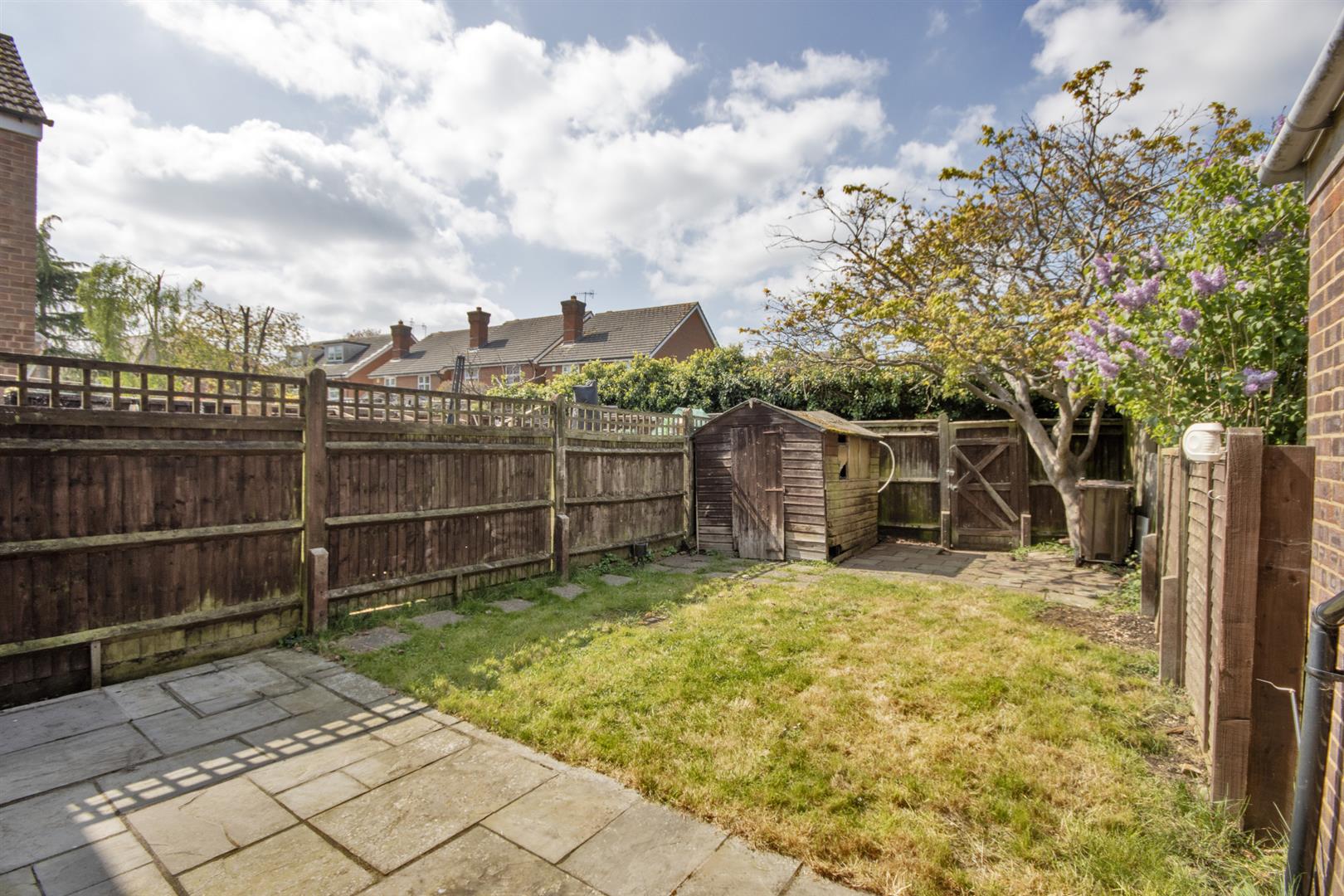 .Low maintenance rear garden mainly laid to lawn with terrace, fenced boundaries, pretty maple tree, garden shed and gate leading to the rear access pathway and bin storage area.