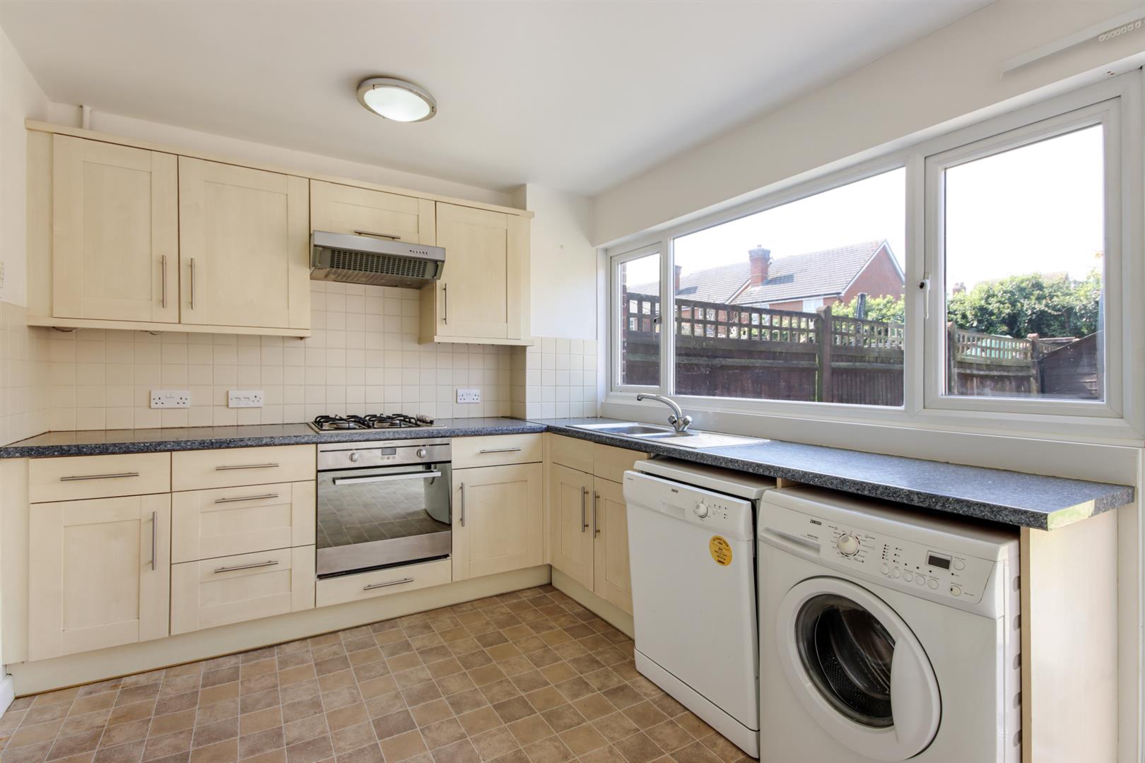 .Open plan kitchen/dining room spanning the rear of the property, fitted with a range of wall mounted cabinets and base units of cupboards and drawers with contrasting laminate worktop and tiled splashback. Fitted oven and four ring gas hob with extractor over, space for dishwasher, washing machine and fridge freezer. Sink unit and window with outlook over the garden, sliding patio doors opening to the rear garden and terrace and space for table and chairs.