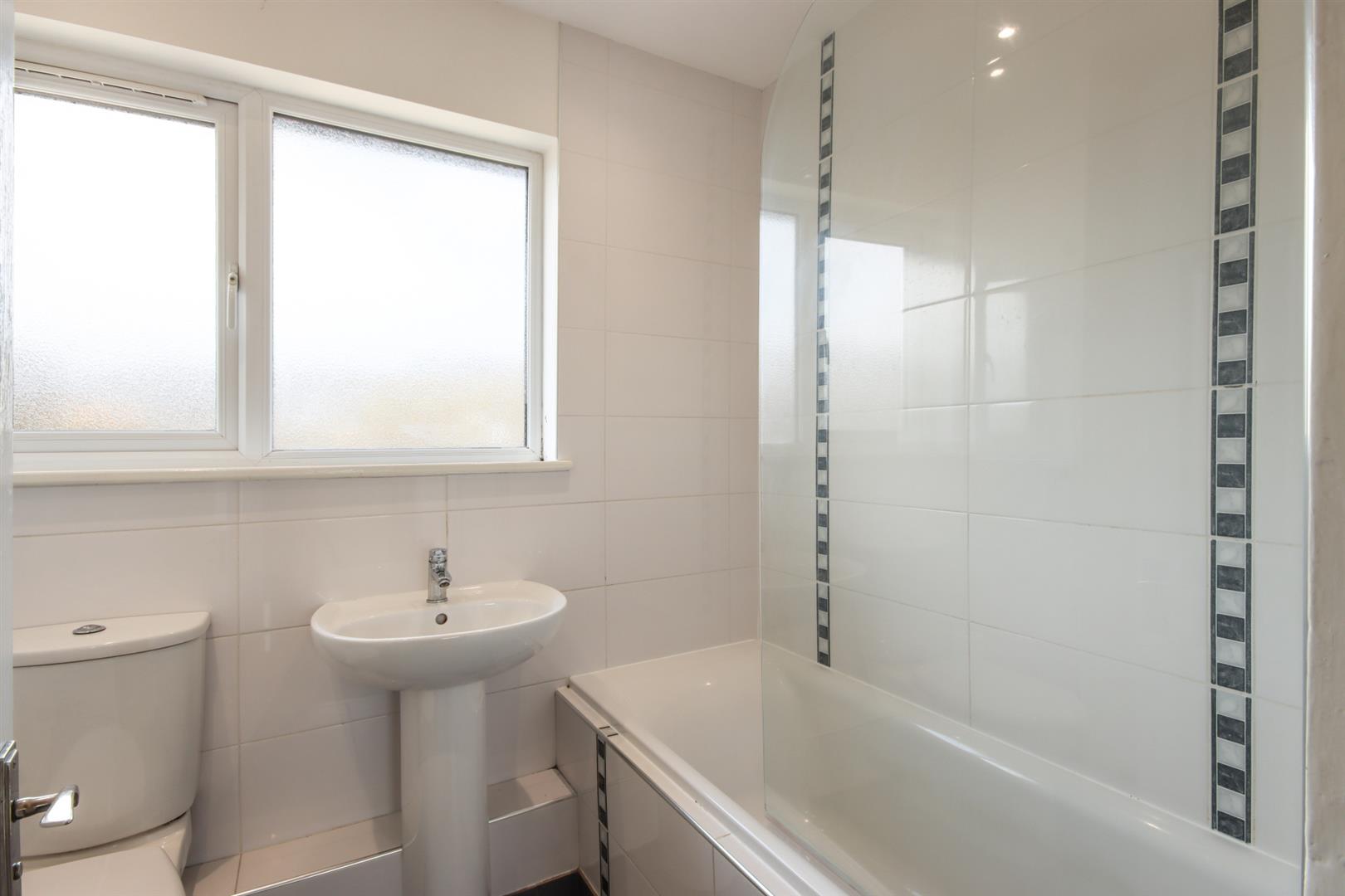 .Family bathroom fitted with a white suite comprising panelled bath with shower over on riser and glazed screen, pedestal sink and close coupled toilet. Fully tiled with border tile and opaque window.