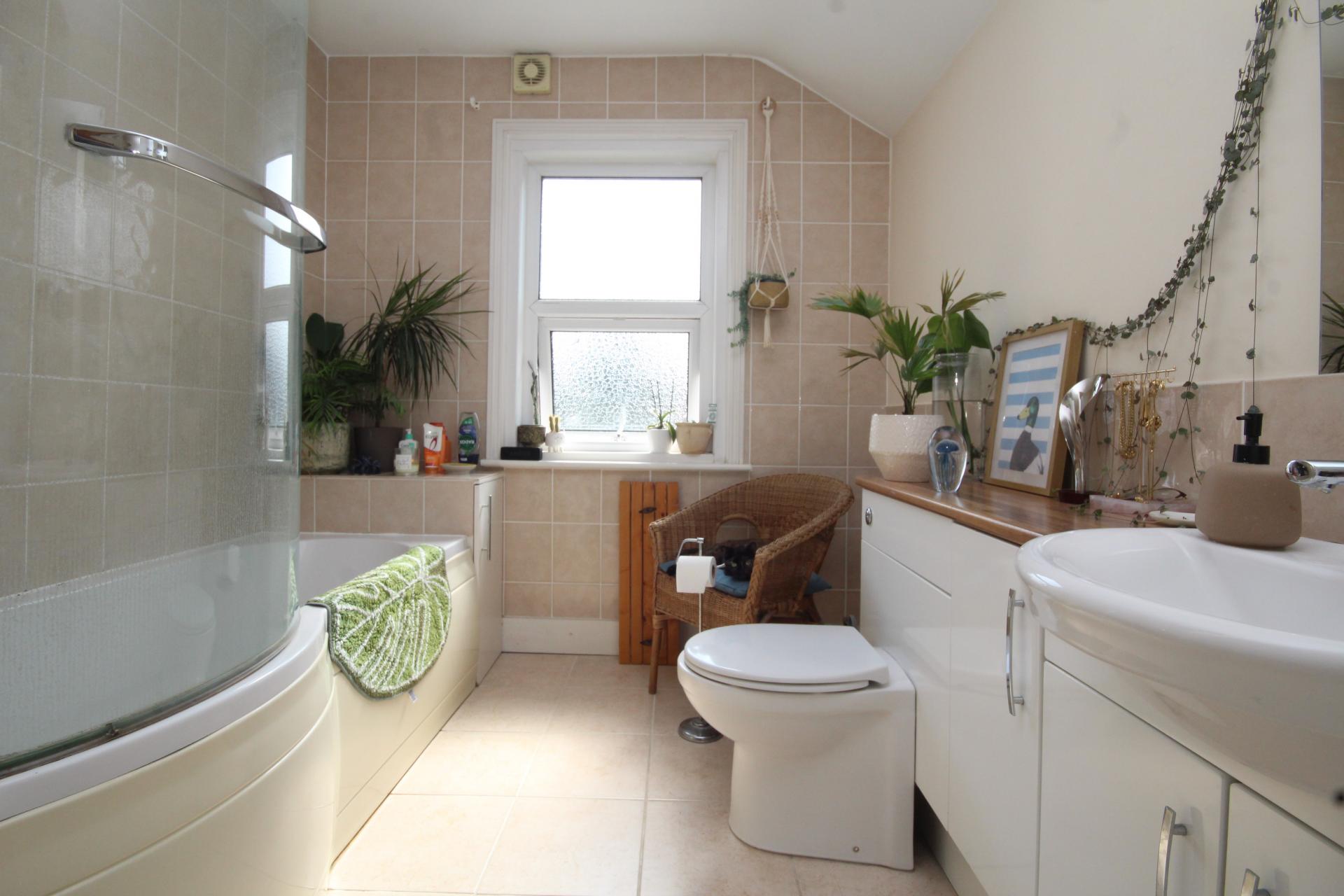 Double glazed frosted window to rear, P shaped bath with shower over, low level W/C hand washbasin set within vanity unit, tiled flooring, ceramic wall tiling, airing cupboard extractor fan and heated chrome towel rail.