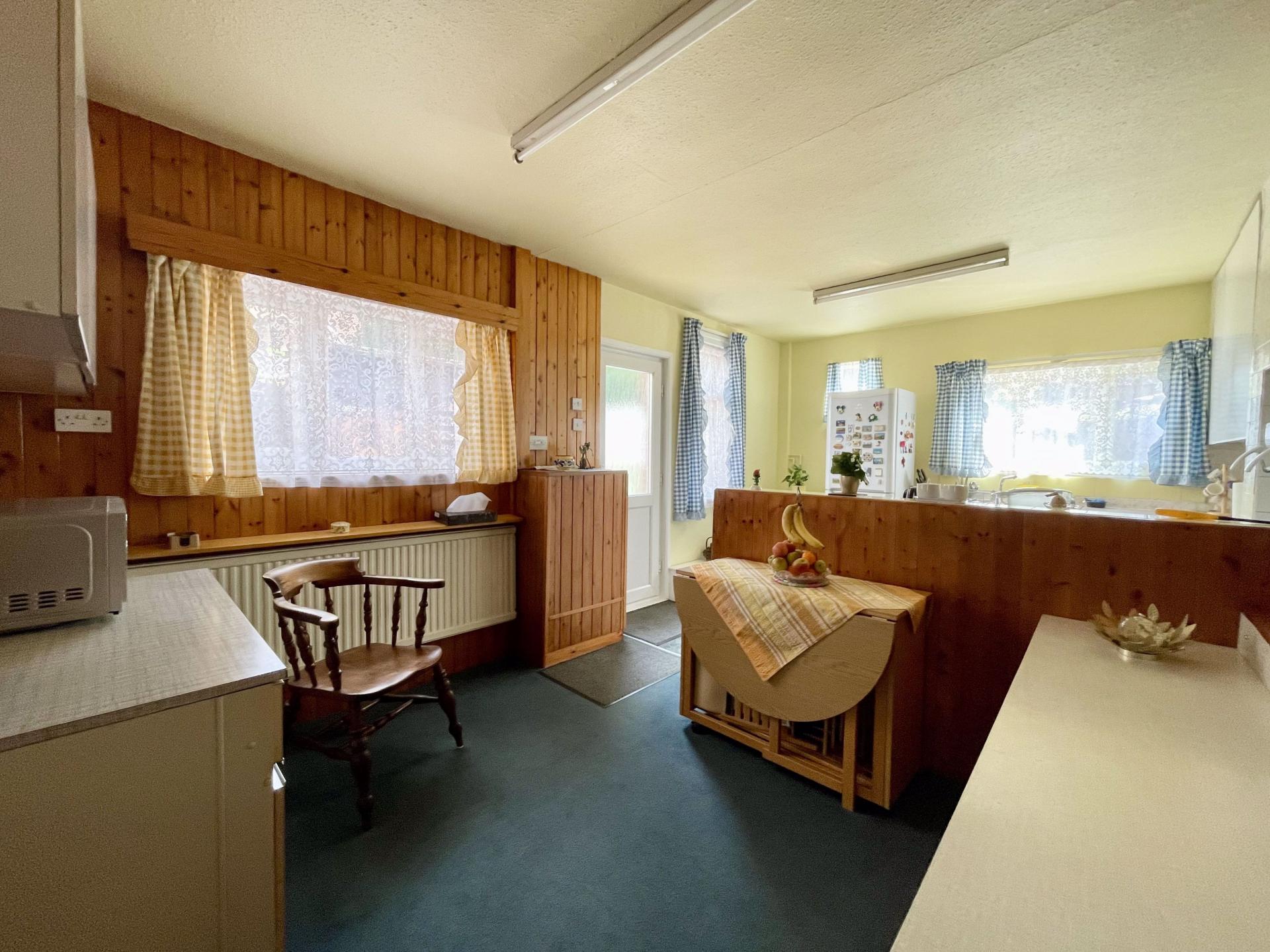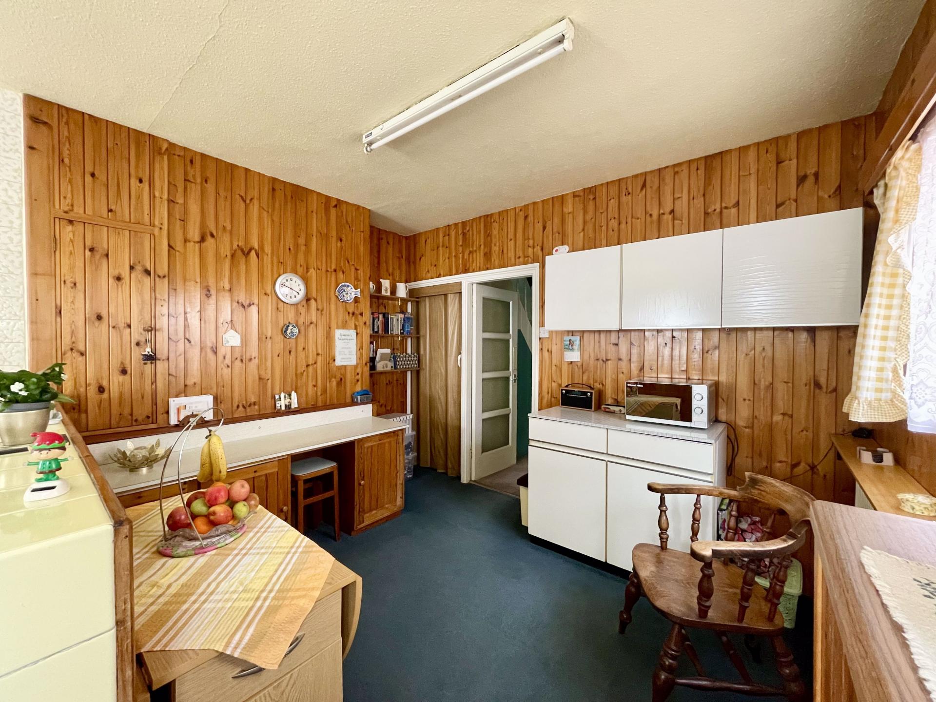 Two double glazed windows to rear, double glazed window to side, stainless steel sink and drainer with cupboards under and a further range of matching base and wall units, space and plumbing for washing machine, space for free standing fridge/freezer, space for gas cooker, part glazed frosted door leading to rear garden.