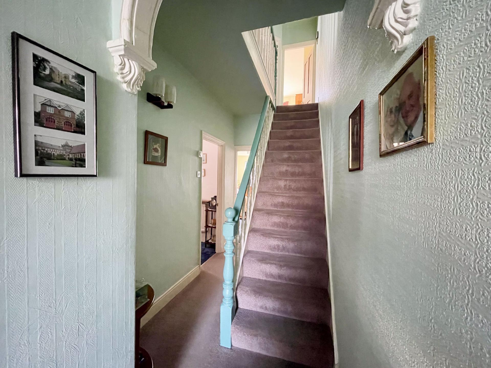 Doors to living room, dining room, kitchen/breakfast room, stairs to first floor landing, under stairs storage and radiator.