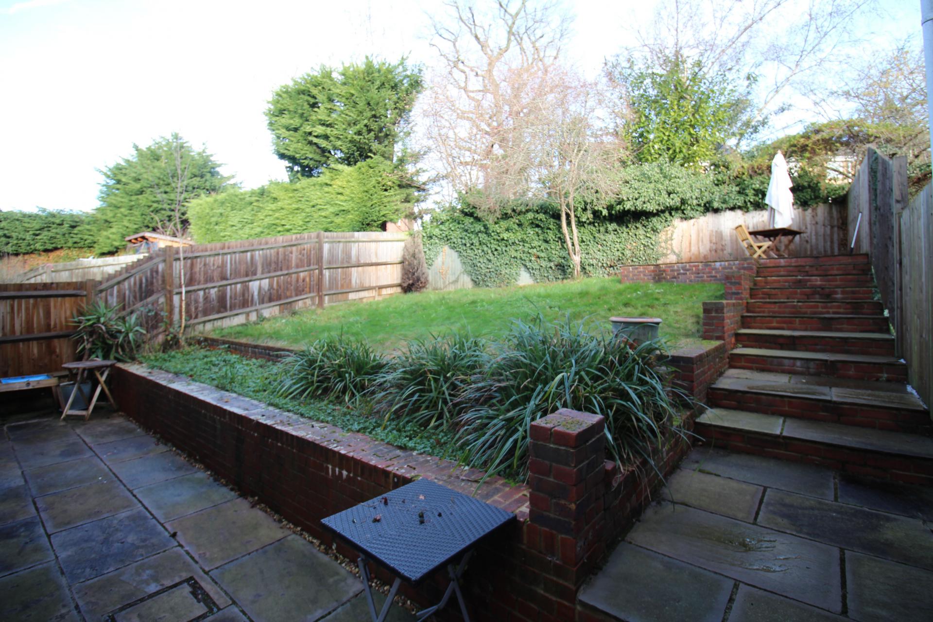 - Attractive tiered rear garden with Indian stone patio areas and lawn, ideal for outdoor entertaining.
