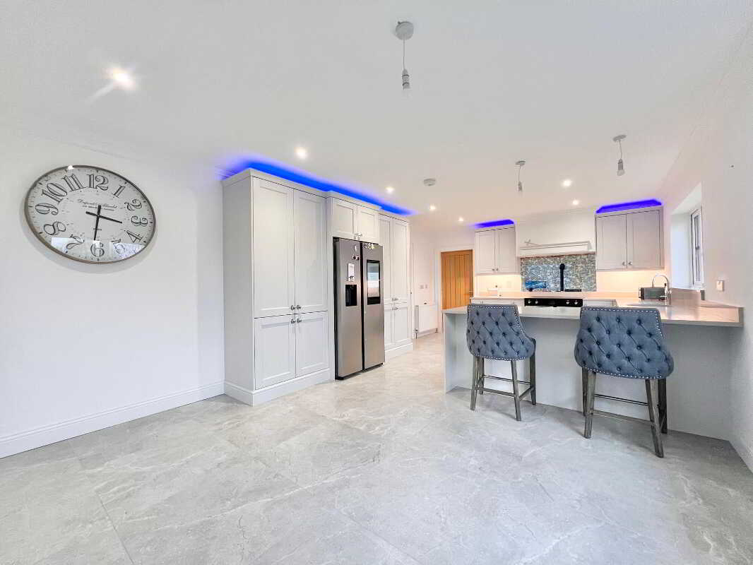 Ground FloorEntrance HallA bright, spacious and elegant entrance hall which showcases an impeccable design with modern tiled flooring and decorative ceiling coving, flowing toward an open solid oak staircase with a gallery balcony. Composite front door.Living RoomA spacious, elegant reception room with plush carpet flooring, ceiling coving and a corner-set open fire with a marble hearth and surround which creates a focal point, complemented by a media wall above for tv.Kitchen & DiningA high specification kitchen and dining area with tiled flooring and ceiling coving throughout. Solid wood eye and low level units, quartz worktops with matching upstands and an antique style mirror splashback. A three seater breakfast bar complements the layout. Integrated appliances include a Quooker boiling water tap, Belling five-ring induction cooker, Indesit dishwasher and a wine fridge. Floor-to-ceiling pantry units offer generous storage with space allocated for an American-style fridge-freezer. The kitchen flows seamlessly into an open plan dining area with direct access to the sun lounge.Sun LoungeA bright, spacious living area with tiled flooring and a vaulted ceiling. A freestanding wood-burning stove sits on a marble hearth, and patio doors opne out to the rear of the property.Utility RoomA spacious utility room with eye and low level, stainless steel sink and drainer unit, plumbed for washing machine, space for tumble dryer, tiled flooring.Boot RoomA convenient space positioned beside the rear door, finished with tiled flooring.Cloak CupboardShower RoomContemporary three piece white suite comprising of wc, whb and vanity unit, walk in power shower with rainfall shower head, illuminated mirror point, feature towel rail, recessed lights, tiled floor.Bedroom 5/PlayroomWith tiled floor, ceiling coving, storage cupboard and access to rear hallway.First FloorLandingAn impressive gallery landing with luxurious carpet and versatile open space suited to a study or reading area.Master Bedroom (En-Suite & Dressing Room)A luxurious king size bedroom with luxurious carpet flooring. Dressing room with carpet flooring and bespoke wardrobes.Property Ref: 11632781_1047115