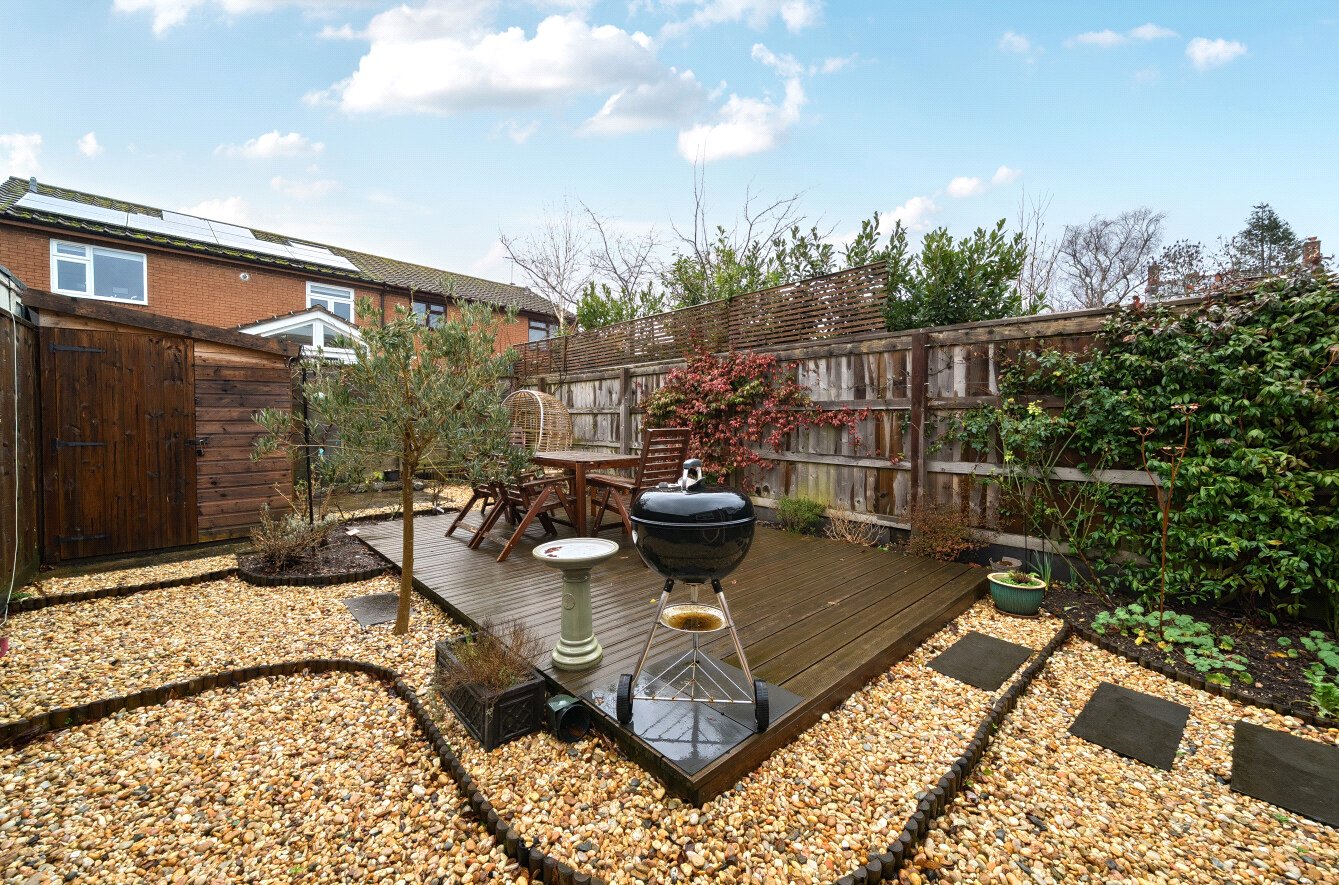 A gravelled area leads to a raised decked seating and entertaining area, located to take full advantage of the afternoon and evening sun. The garden is completed with a large shed providing the property with additional storage.