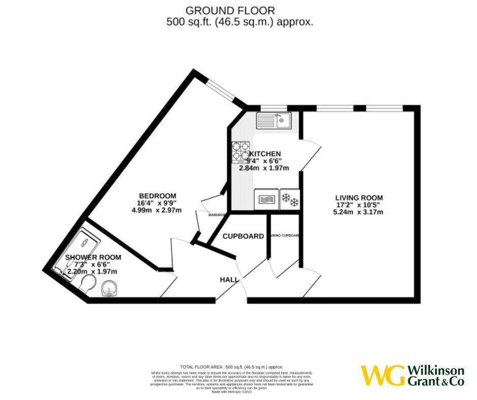 The apartment offers a good sized sitting room/dining room with ample space for a table and chairs. The kitchen is fitted with a number of units, including an integral fridge/freezer. There is a generous double bedroom with fitted wardrobes and the fully tiled bathroom has a walk in shower for ease of access, wash hand basin and WC.