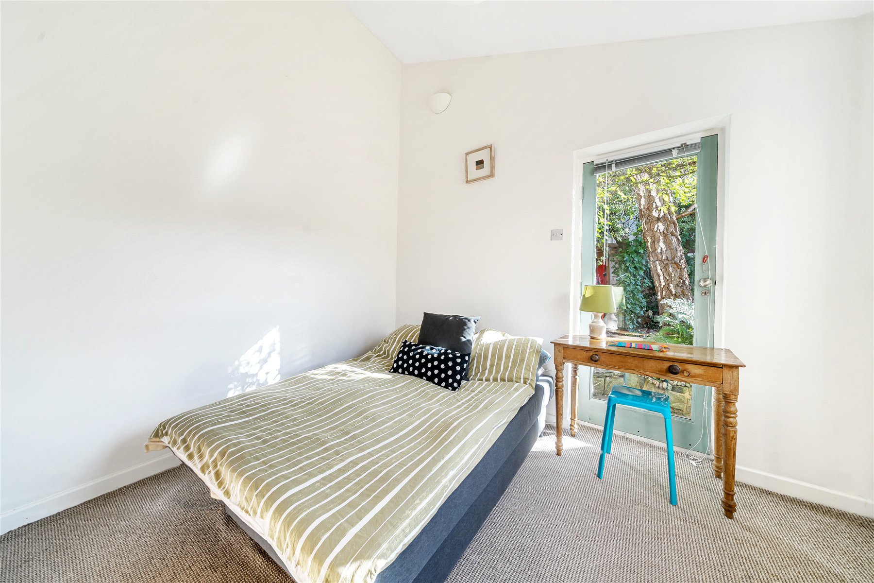The hallway features high-level shelving and doors leading to the bedroom 3/office/study with its own door to the garden, as well as the bathroom with a white suite and Velux window. The lower ground floor includes a characterful family room with a wood burner and a separate shower room.