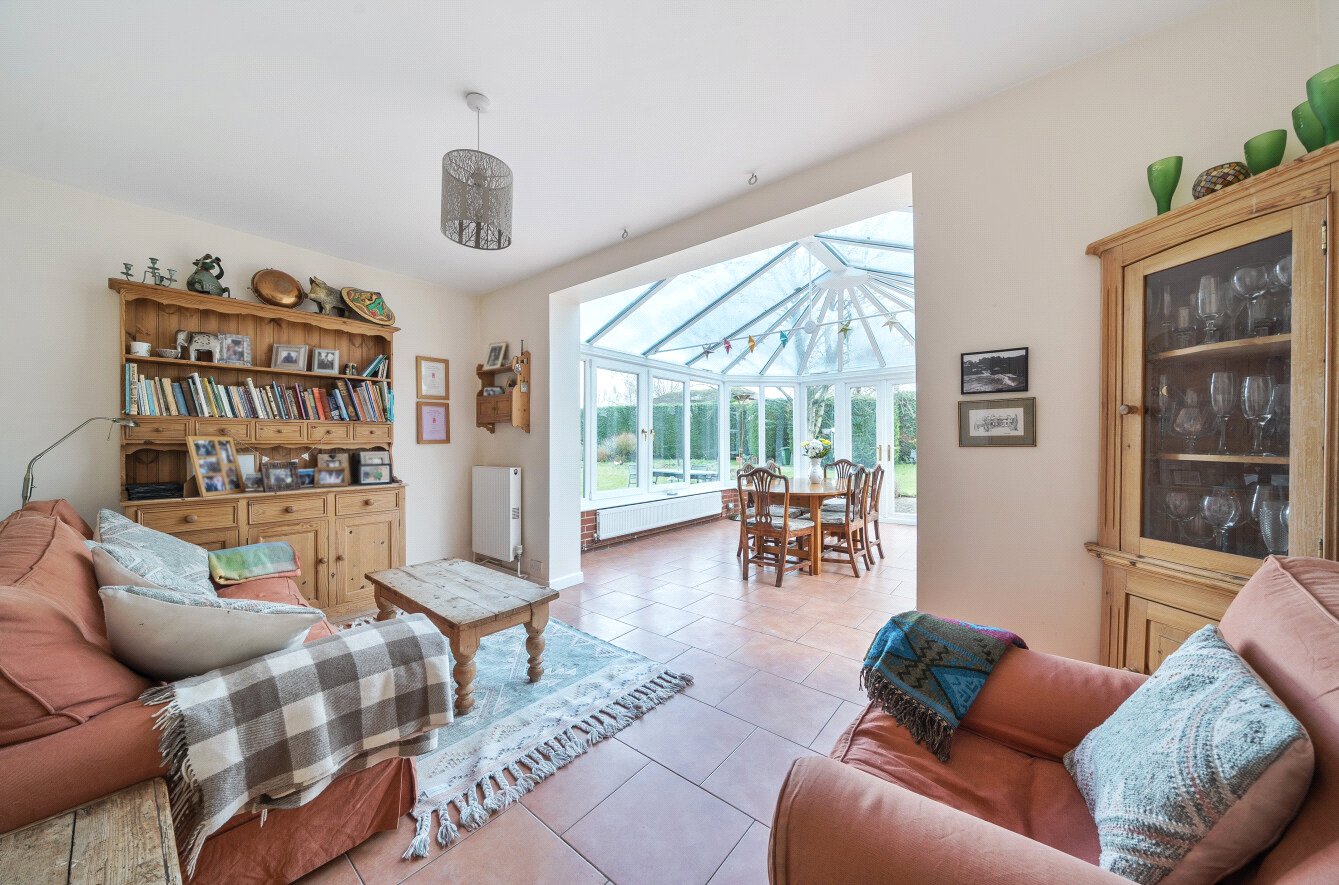 To the rear, a dining room opens into a conservatory, allowing for lovely garden views and direct access to the patio area. The ground floor is completed by a modern cloakroom and ample storage throughout.