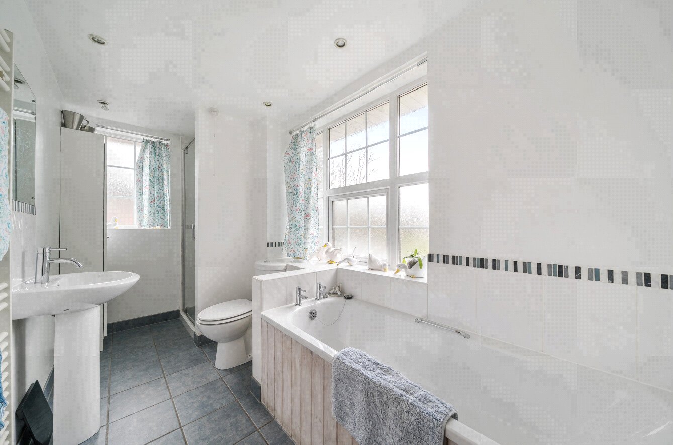 On the first floor are three well-proportioned bedrooms, all enjoying garden outlooks, with some benefiting from a dual aspect. There is also a modern family bathroom with a shower cubicle and further built-in storage.