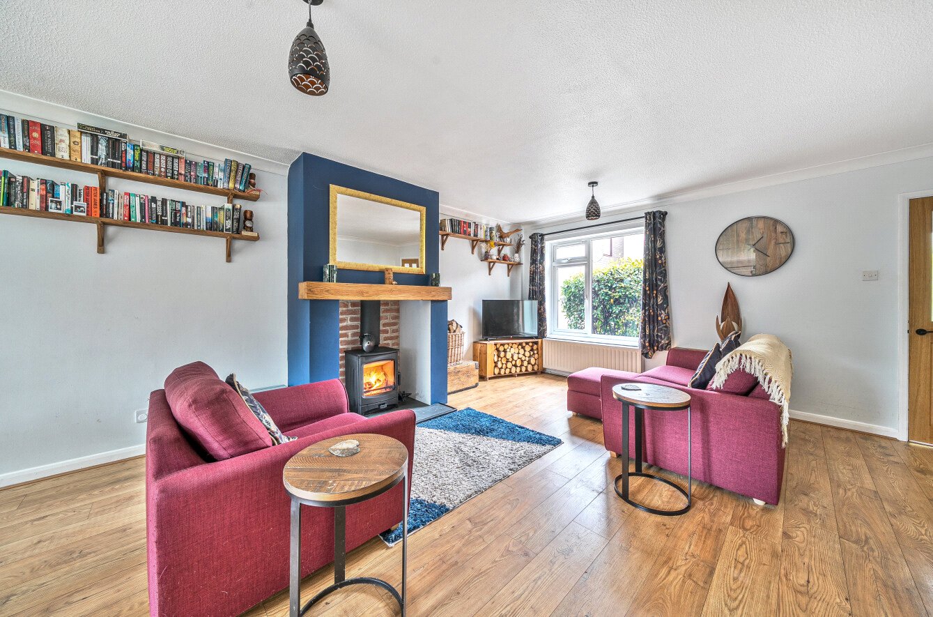 Quietly located less than 300 meters from Topshams shops and amenities, a paved path with adjoining mature shrubs leads to an entrance hall with useful wash cloakroom. The 27ft sitting room/dining room enjoys laminate oak flooring, feature fireplace with freestanding wood burning stove, bespoke fitted understairs storage and direct access to the rear garden.