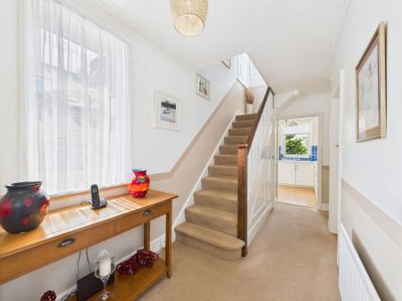 A wide and inviting inner hallway bathed in natural light, featuring stairs rising to the first floor, under stairs storage, and access to all principal ground floor rooms. uPVC double glazed windows and a gas central heated radiator.