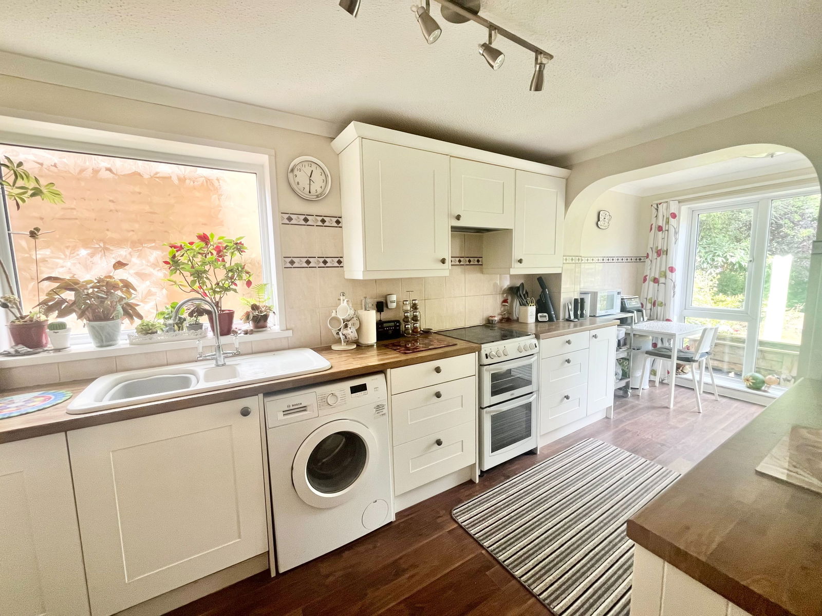 KITCHEN/BREAKFAST ROOM - 5.74m x 2.42m (18'9" x 7'11") A bright and airy kitchen/breakfast room with a variety of wall mounted, base and drawer units. Wood effect roll edge worktops. An electric oven with a 4 ring gas hob and extractor hood over, an integrated dishwasher. Space and plumbing for a washing machine and fridge/freezer. Complimentary tile splashback surround. A 1 1/2 bowl porcelain sink and drainer unit, space for a 4 seater dining table. A large UPVC double glazed window overlooking the rear gardens, a UPVC double glazed French door leading out to the garden and gas central heating radiator.