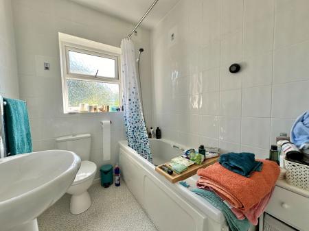 BATHROOM Fitted with a matching three piece white suite comprising a pedestal hand wash basin, push button WC and a panel fronted bath with mains shower above. Fully tiled walls and vinyl hard flooring. Chrome heated towel rail. Frosted double glazed window to the rear aspect.