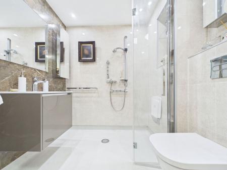 SHOWER ROOM A stand out shower/wet room, three mirrored cabinets, wall hung radiator, low level WC, wash basin, shower with adjustable glass shower screen.
