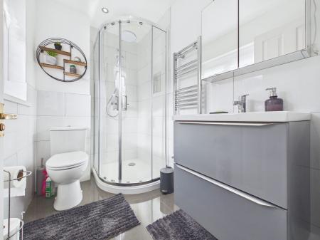 SHOWER ROOM Modern shower room comprising of cubicle shower, hand wash basin with vanity unit, mirrored bathroom cabinet, obscure window to front and wall hung radiator.