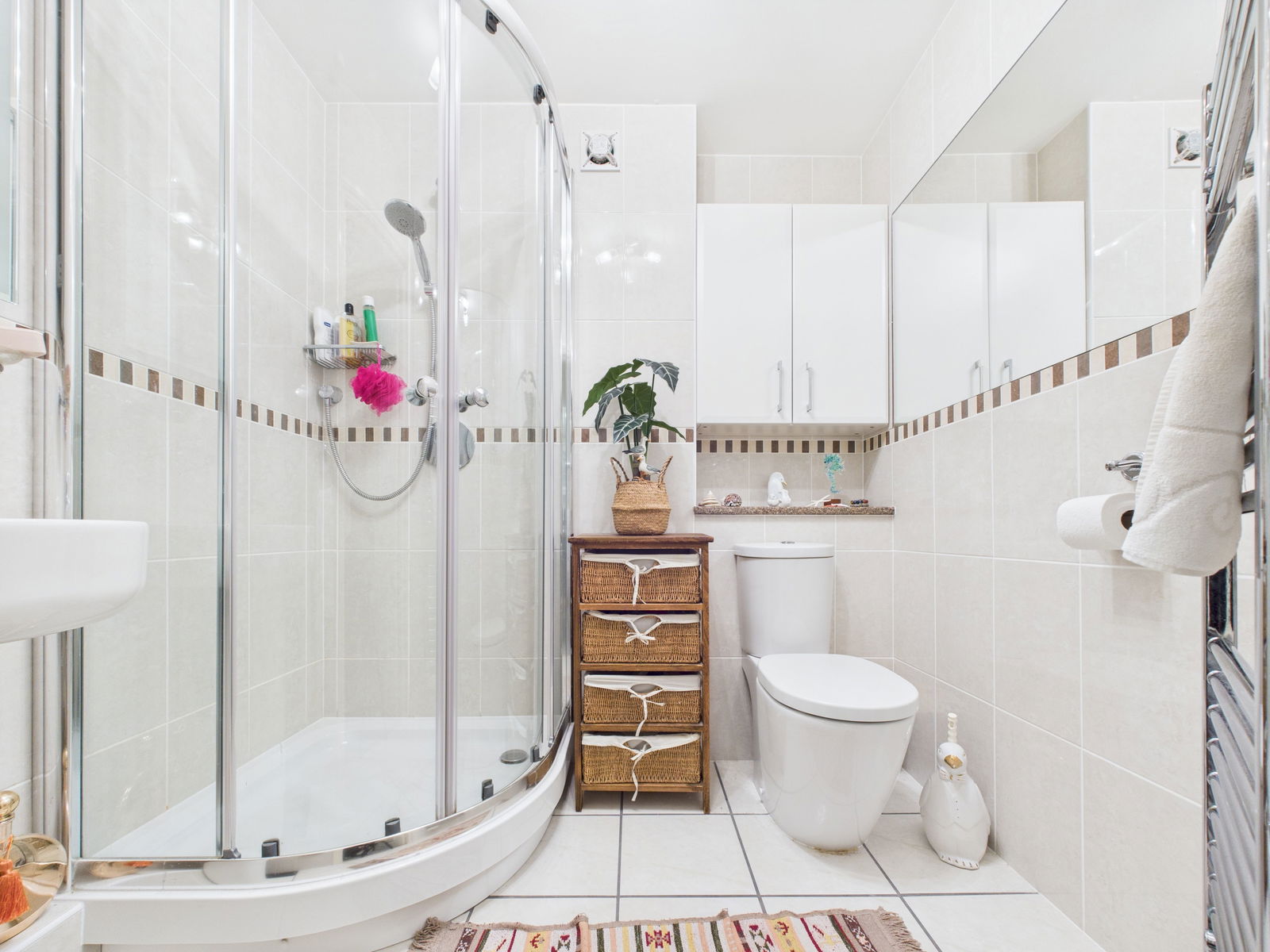 MAIN SHOWER ROOM Walk in shower cubicle with shower fitment wash hand basin and close WC. Tiled walls and floor. Built in cupboard. Illuminated mirror over sink.