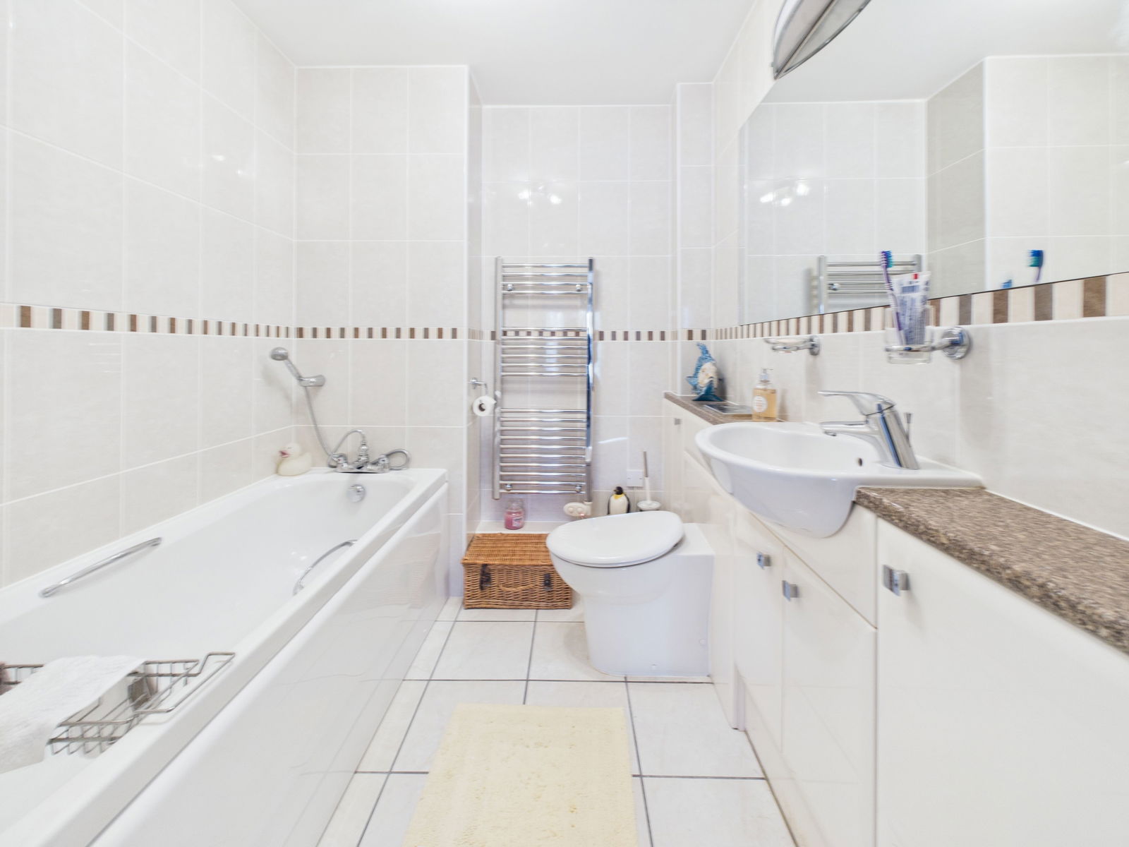 ENSUITE BATHROOM Fitted with a white suite comprising bath with shower attachment over, wash hand basin, wall mounted sink and low-level WC with concealed cistern . Heated towel rail. Tiling to walls and floor.