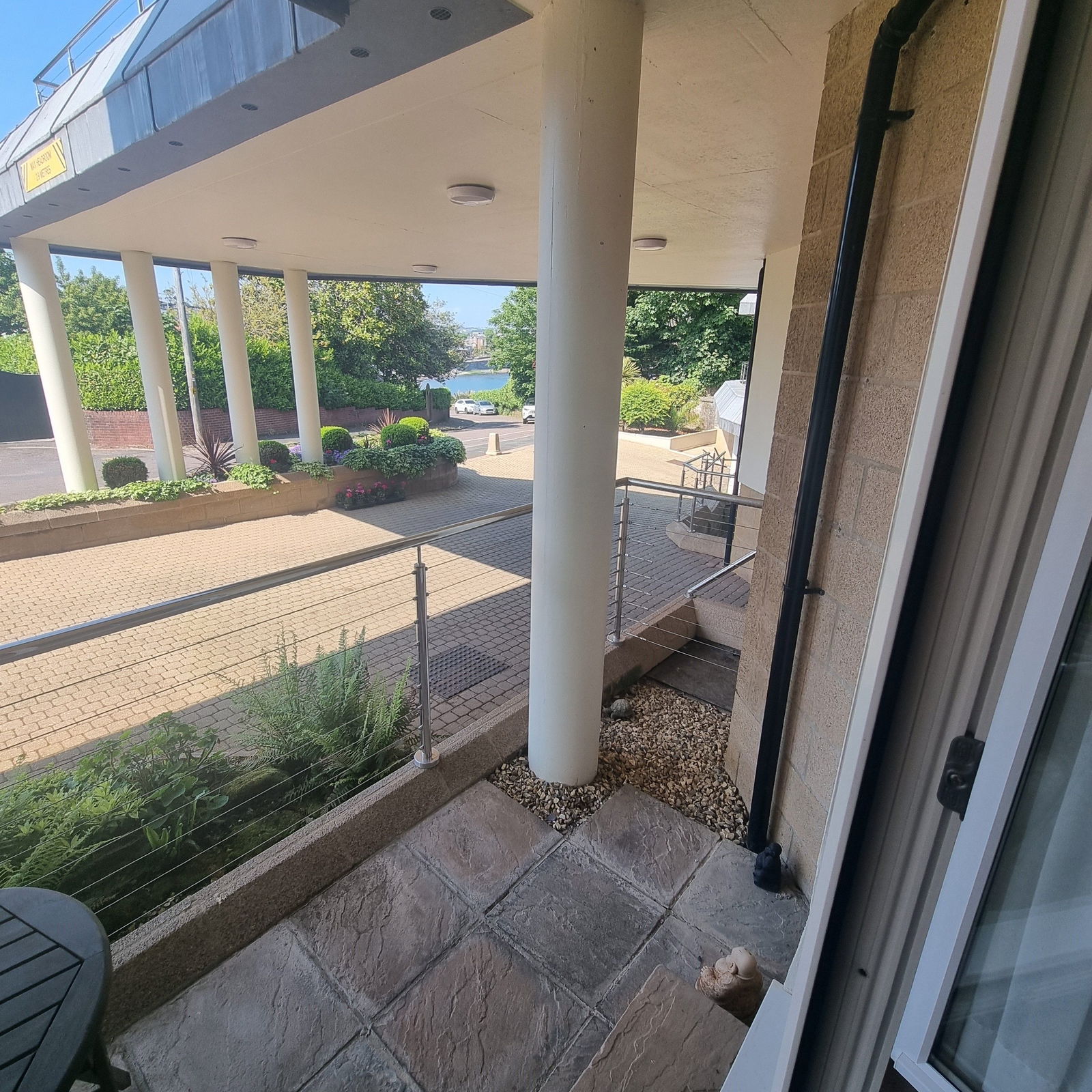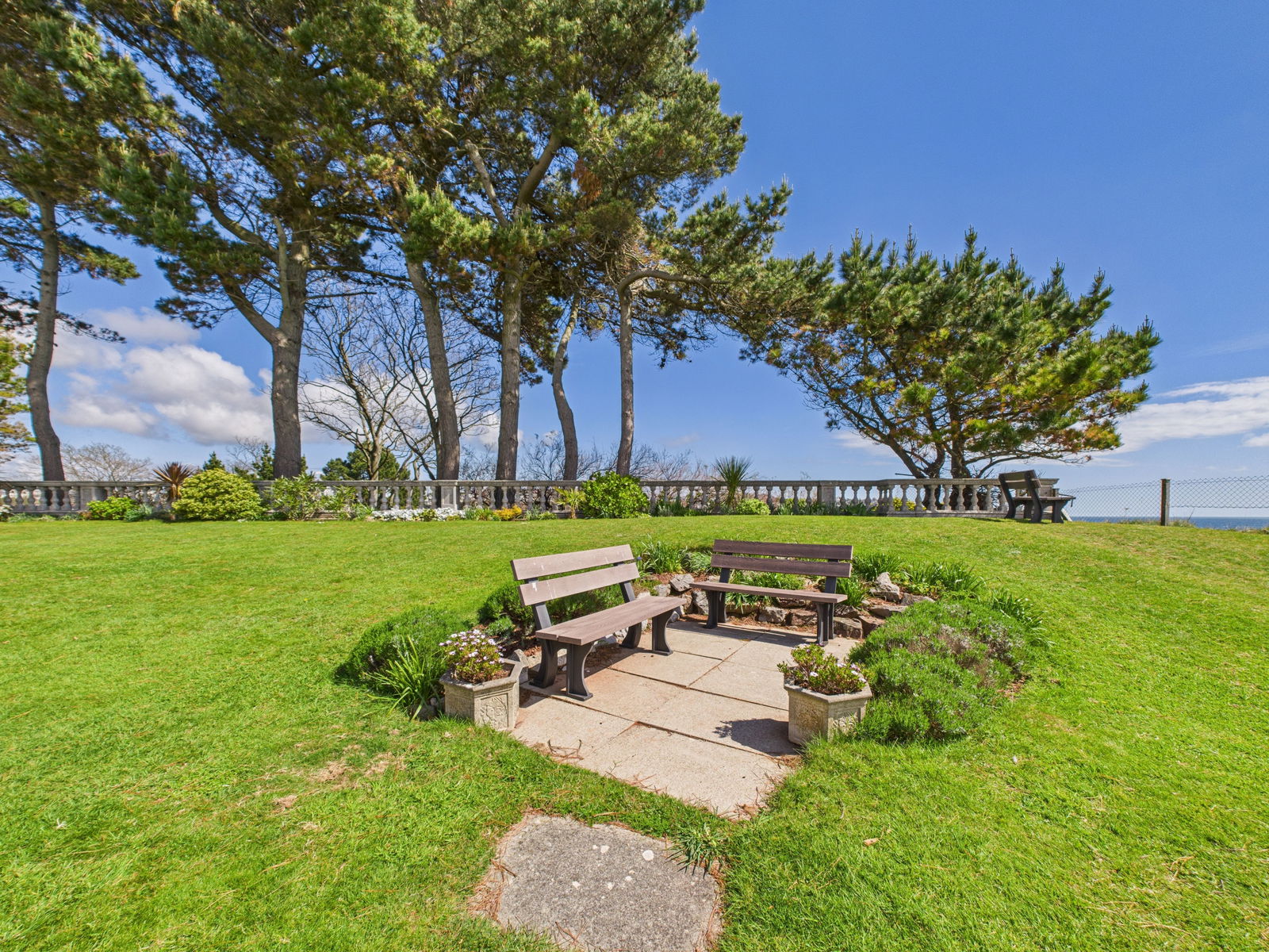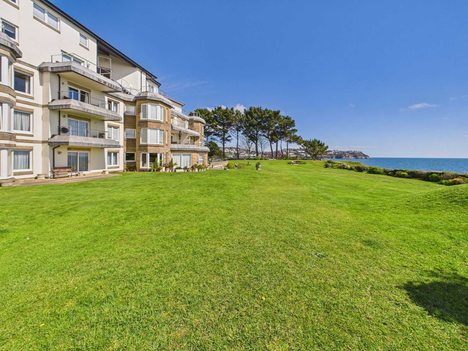 OUTSIDE Standing in large communal grounds which wrapped around the building and come complete with tables, chairs and benches to relax on and enjoy the stunning sea views.