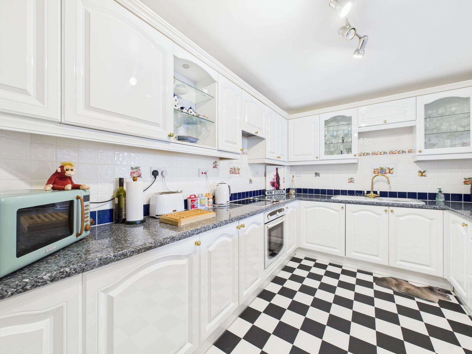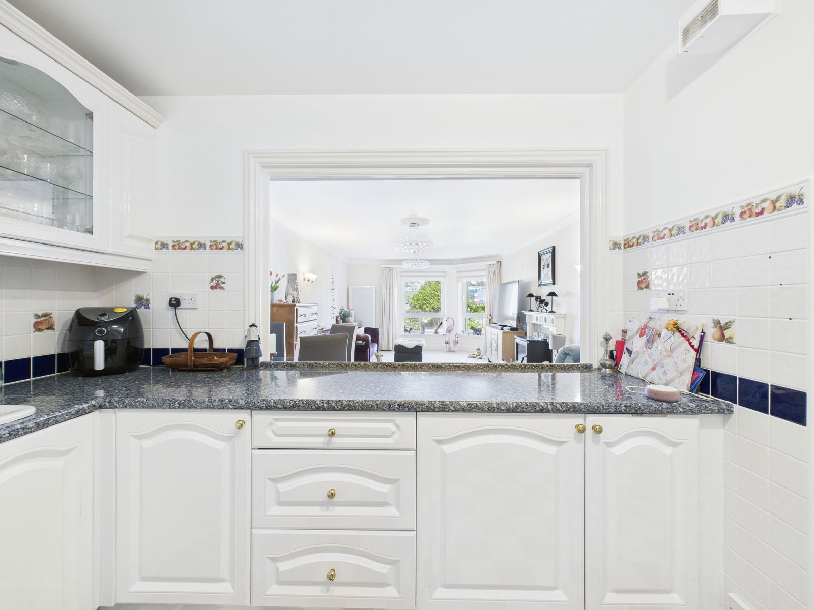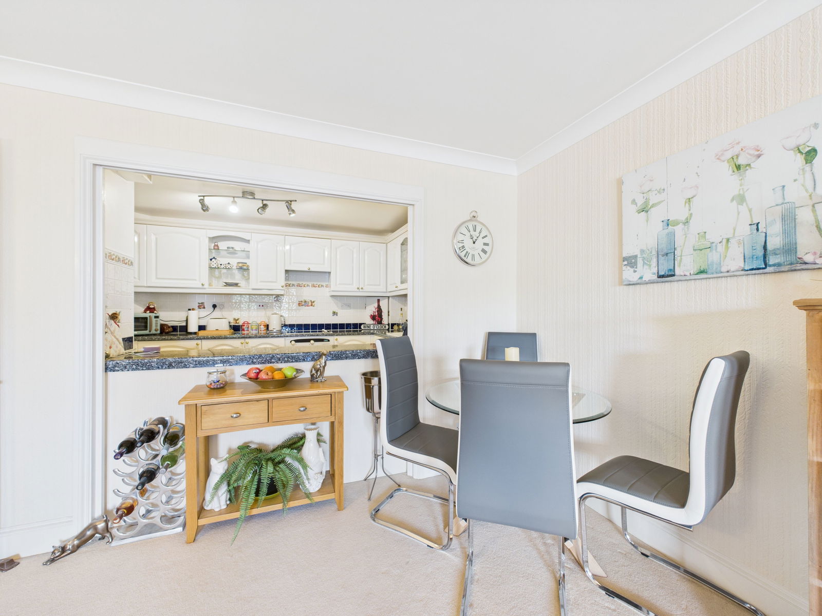KITCHEN - 3.7m x 2.6m (12'1" x 8'6") A well-appointed kitchen fitted with a comprehensive range of white wall and base units with work surface over. Integrated oven/grill with glass electric hob and cooker hood over. Integrated fridge and freezer and combi washer/dryer machine. Wall tiling and display shelving. Large opening to the lounge/diner.