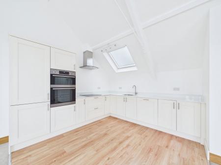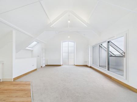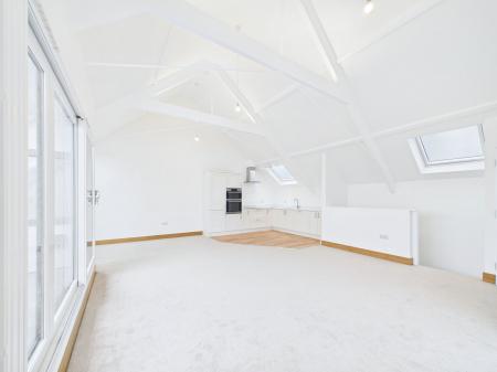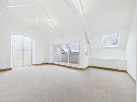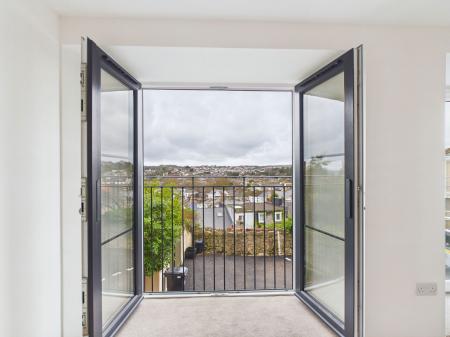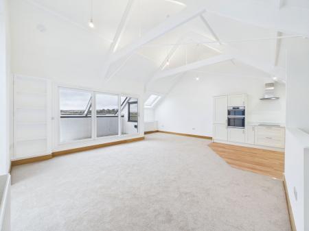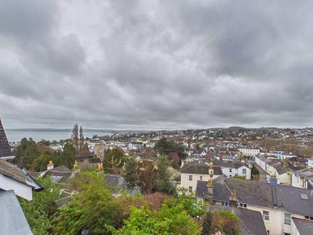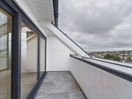 PENTHOUSE LOUNGE/DINING/KITCHEN AREA measuring 6.0 m x 5.4 m max overall. This impressive room has the original vaulted ceiling with exposed timber structure and access to a recessed balcony from which there are panoramic views. The lounge/dining area can be laid out in various formats to take advantage of the views. There are three radiators and ample power points and a TV point. A particular feature of the room is the large frosted double glazed arched window measuring almost 3 m in height, which creates an added feel of spaciousness and light. The kitchen area has been fitted with a range of quality cream coloured woodgrain effect base units topped with a quartz worksurface and complementary splashback. It is equipped with an AEG induction hob with stainless steel cooker hood over along with an AEG double oven and grill and a Hisense fridge freezer. There are ample cupboards and pan drawers with there being space also for additional shelving or cupboard units if desired. There are also two swinging book shelving units with cupboards concealed inside, one hidden cupboard houses the Combi boiler. In addition to the large feature window and patio doors there are two Velux double glazed skylight windows which offer this room high light levels. Within the vaulted ceiling two contemporary feature light fittings. The 3.7m wide recessed balcony enjoys a sunny aspect and spectacular open views across Torquay and the bay.