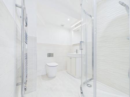 ENSUITE A contemporary suite comprising shower cubicle with glazed door and mains fed shower with oversize shower head and body spray. Wall mounted wash hand basin with chrome mixer tap over mirror and courtesy light. Wall hung radiator and low level WC.