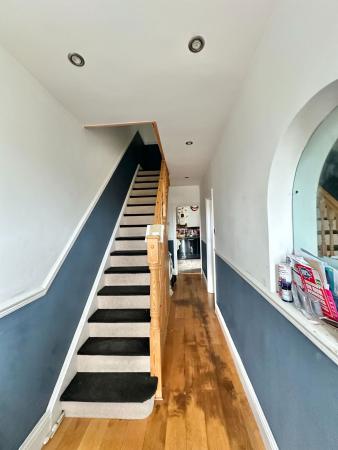 ENTRANCE HALLWAY Double glazed door with frosted window panel to the front aspect along with a double glazed frosted window to the front aspect. Wood effect hard flooring and carpeted stairs leading to the first floor. Doors to:-