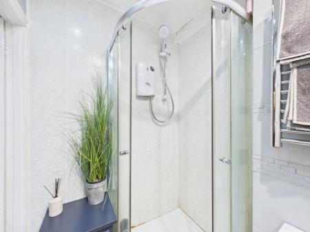 SHOWER ROOM - 2.59m x 1.24m (5'42" x 4'0.8") Walk-in corner shower cubicle with Mira power shower. Heated hand towel rail. Wall-mounted sink. Low level WC. Extractor fan, Spotlights. Shaver-point.