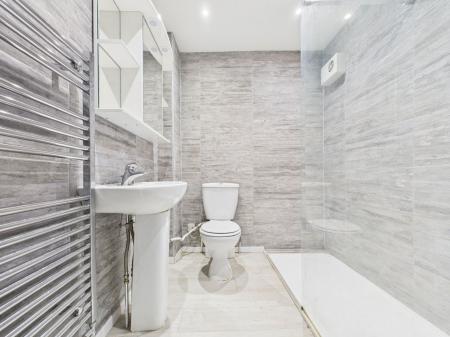 BATHROOM - 1.88m x 1.86m (6'2" x 6'1") Shower room with double sized shower, low level WC, wash hand basin, wall hung radiator, tiled floor to ceiling.