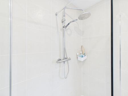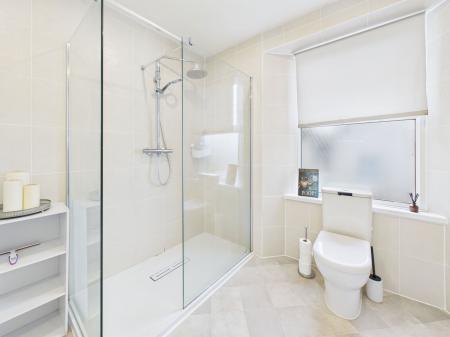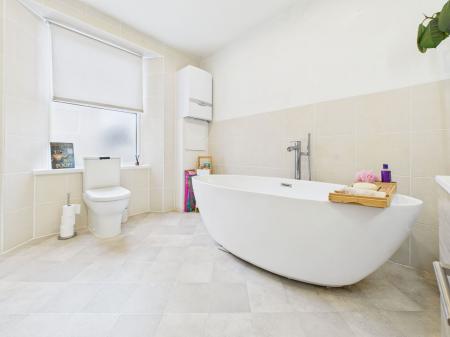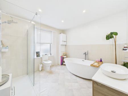 BATHROOM - 3.17m x 2.92m (10'4" x 9'6") A large modern refurbished bathroom, double sized glass shower unit, modern bath, low level WC, wall hung radiator, wash basin vanity unit, combi boiler.