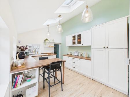 KITCHEN/DINER - 4.65m x 3m (15'3" x 9'10") A big kitchen/diner/breakfast room. A modern fitted kitchen with cupboards and drawers over and under surfaces, a large pantry cupboard, fitted breakfast bar and ample space for a dining table. Velux windows. Under floor heating.