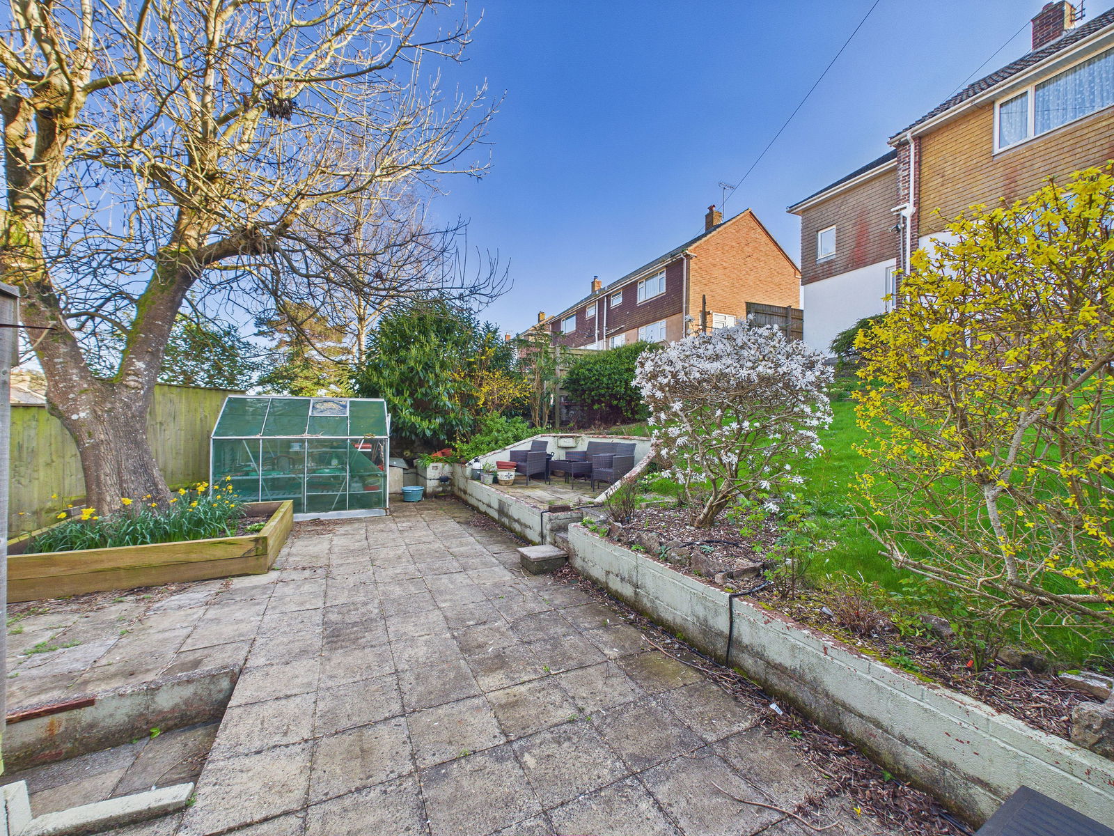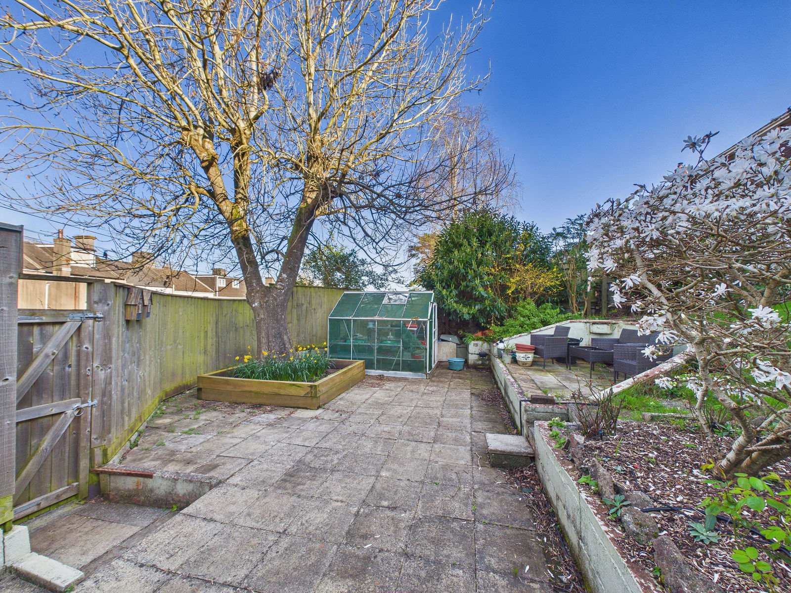 OUTSIDE Garden fully enclosed large sunny back garden with two patios and lawned area, a gate leads to a garage with two parking spaces which provides peace of mind.