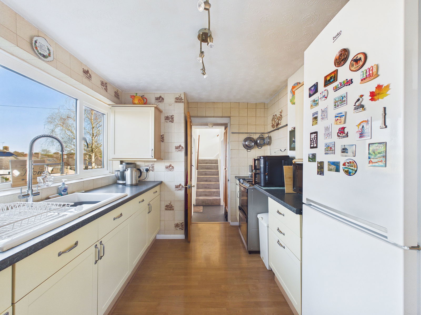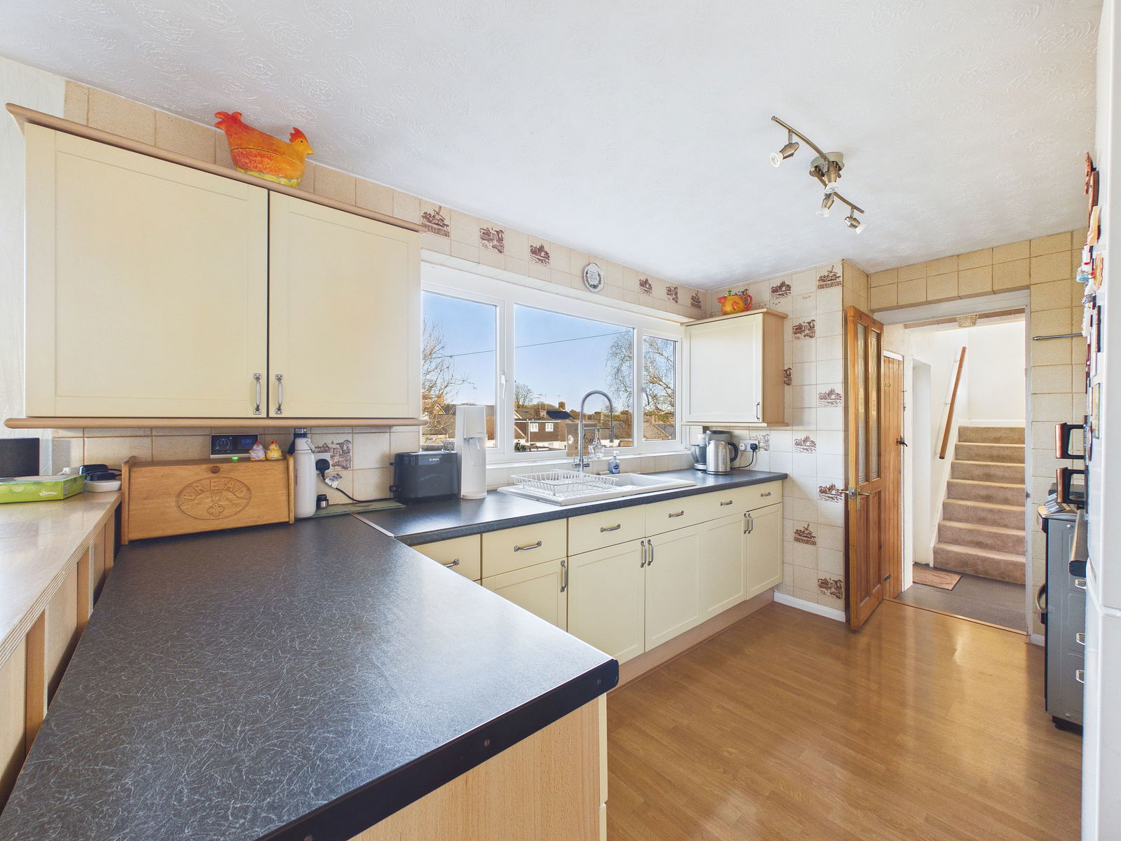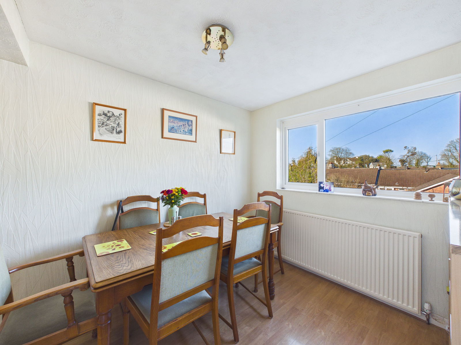 KITCHEN/DINER A large open plan kitchen/diner which has space for a six seater dining table, the kitchen has cupboards and drawers over and under surfaces, ceramic sink unit, space for fridge/freezer, cooker and two windows looking out to back garden.