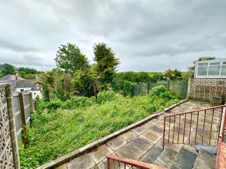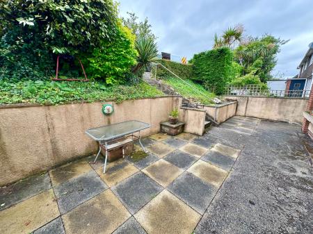 OUTSIDE To the front is a good sized patio garden with elevated landscape banks and inset with a variety of mature shrubs offering a degree of privacy. Cold water tap. Side path to the rear. There is a large rear garden with patio area adjacent to the property with steps leading down to a large garden area which is in need of cultivation.