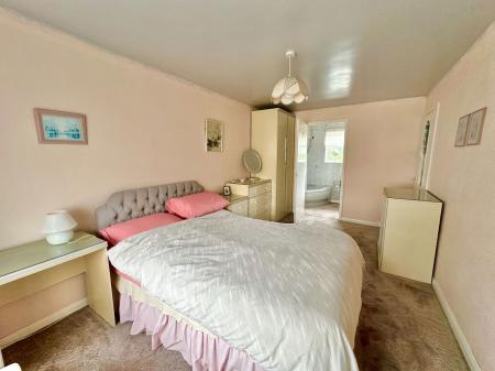 ENSUITE BATHROOM Fitted with a grey three-piece suite comprising corner bath with electric shower fitment over, vanity unit with inset wash handbasin and matching close coupled WC. Fully tiled walls. Double glazed window with open outlook. radiator.