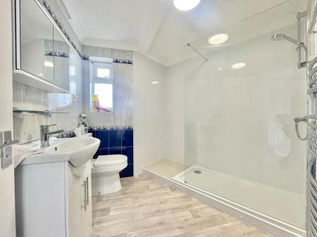 SHOWER ROOM Built-in shower cubicle with fitted shower unit. Wash basin and WC. Tiled walls. Double glazed window.
